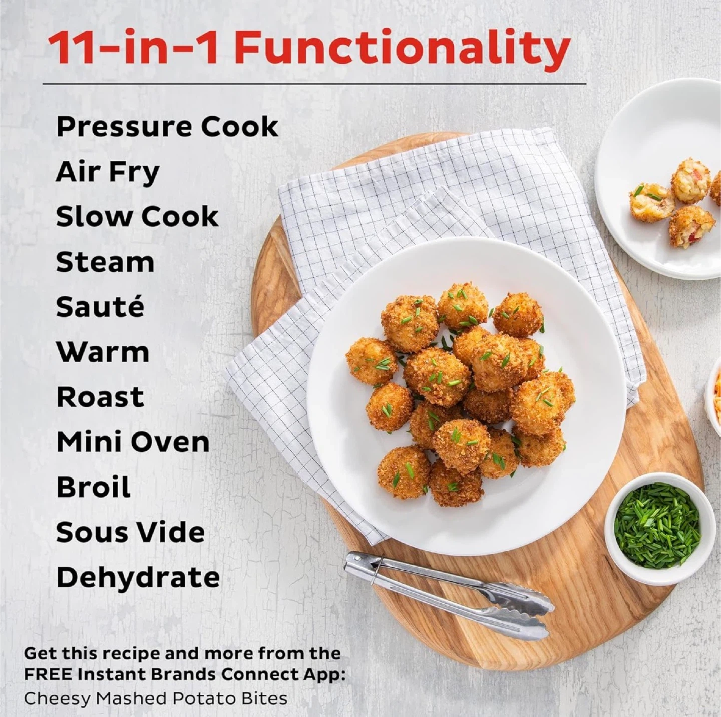 - Two lids: Pressure + Air Fry. 11‑in‑1: pressure cook, sauté, slow cook, sous vide, steam, warm, air fry, roast, bake, broil, dehydrate.