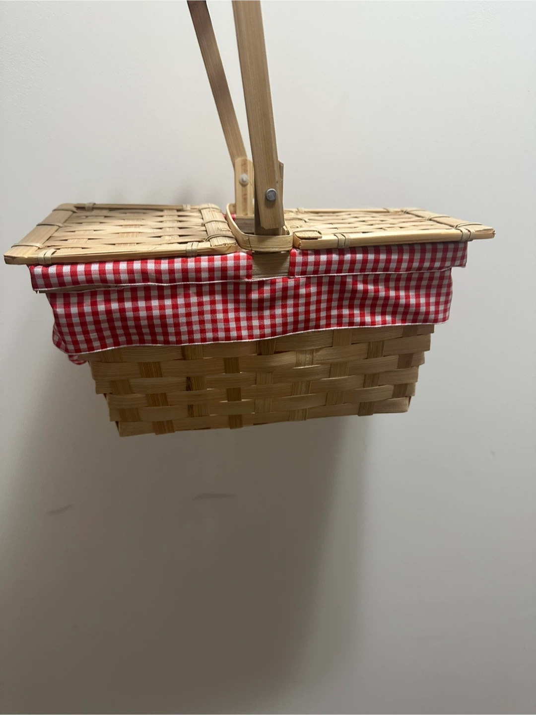 A charming picnic basket featuring a red and white gingham liner and bow accent. It's made of natural woven material with a sturdy wooden handle. This basket is perfect for outdoor gatherings or as a decorative storage item!