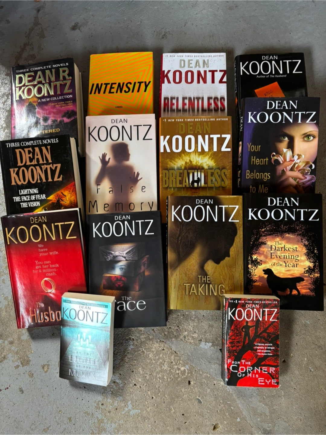 15Selling a collection of Dean Koontz novels! Titles include Intensity, Relentless, False Memory, Breathless, Your Heart Belongs to Me, The Taking, The Darkest Evening of the Year, From the Corner of His Eye, and more! Perfect for any fan of suspense and thriller novels