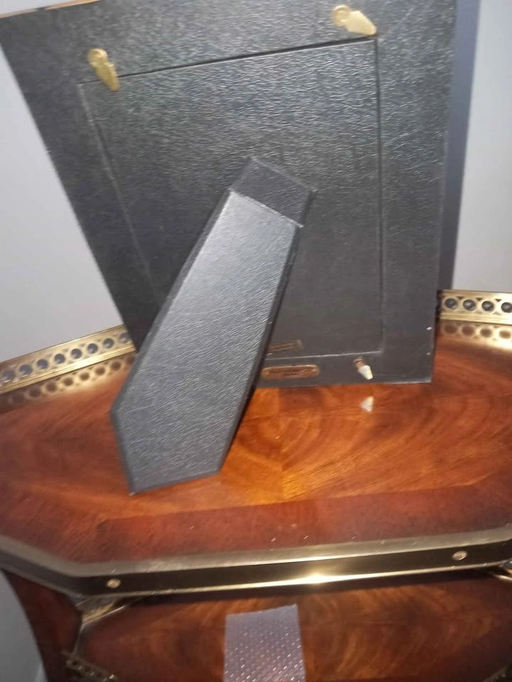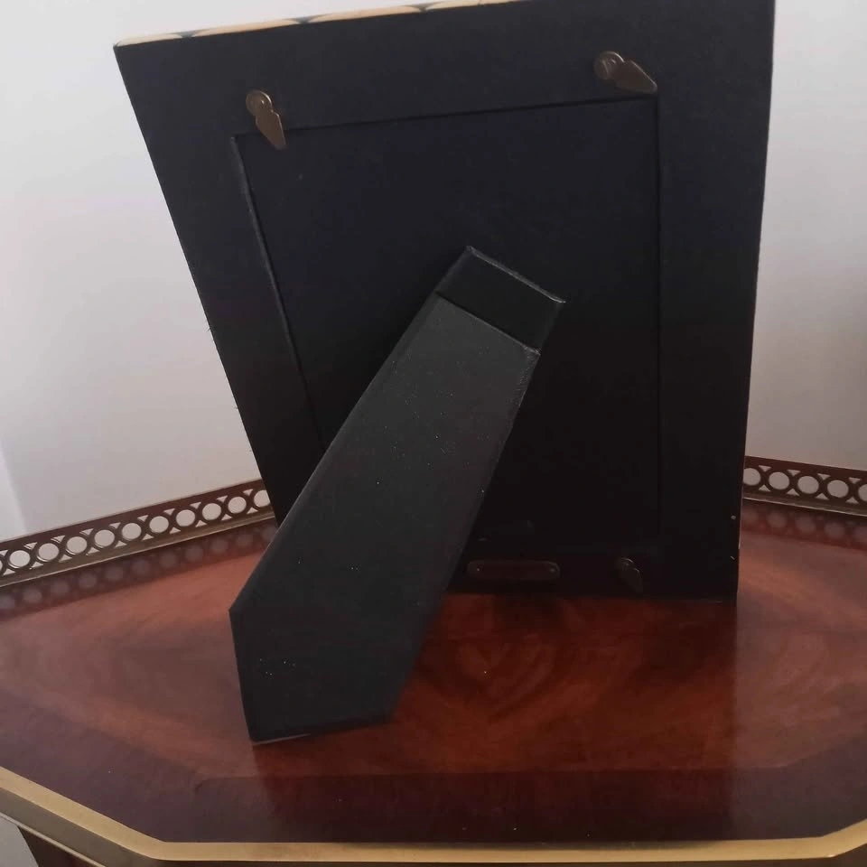 Authentic leather back with gold plate engraved with designer's name. Post-modern design. Famous for intricate use of natural materials. 5"x7", no glass.