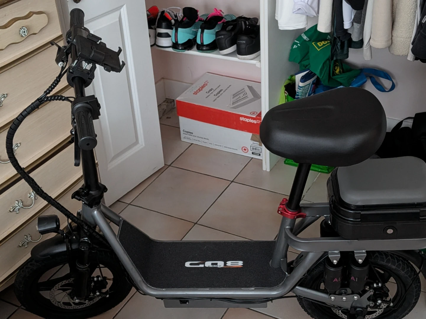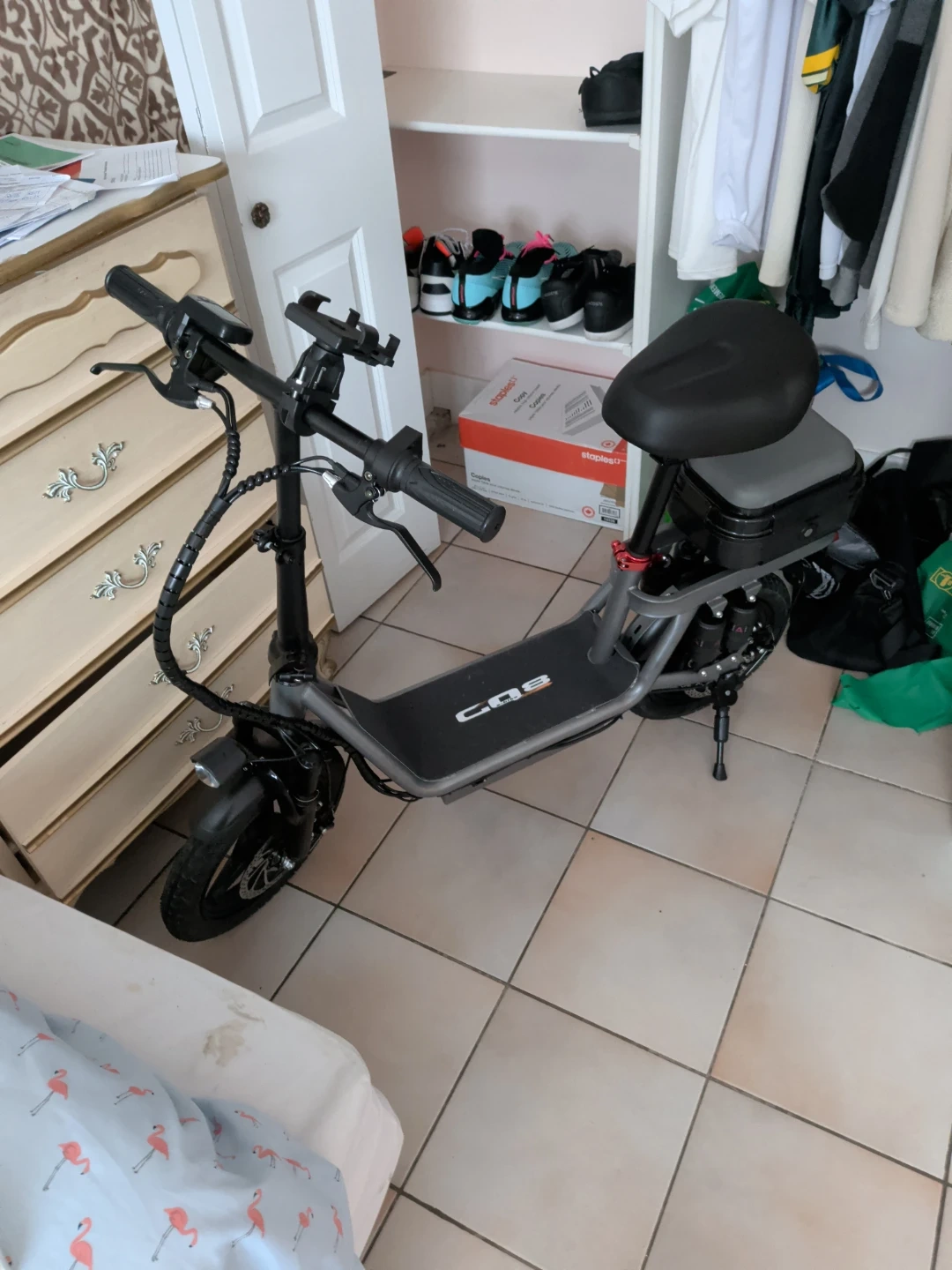 This is a gray COQ electric scooter with a comfortable seat and storage. It has front and rear lights for visibility. It's great for getting around town!