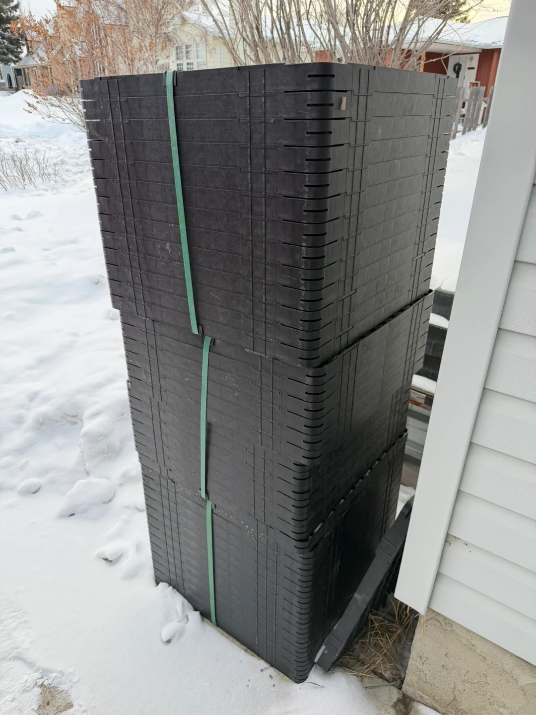 This is a stack of black plastic grates. They're made of durable plastic and are strapped together. Perfect for organizing items in a garage or storage unit.
