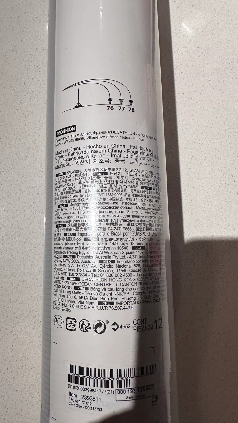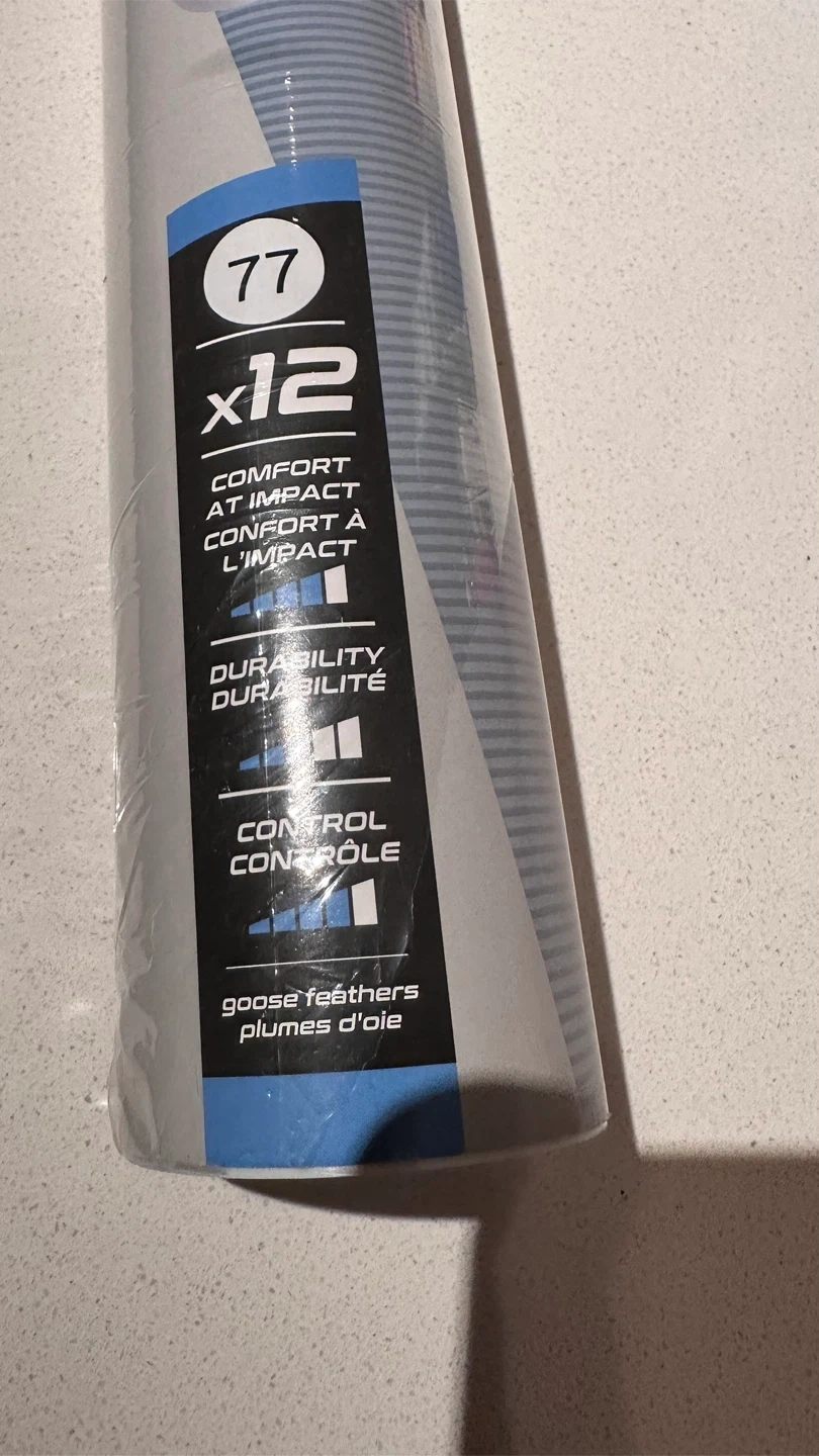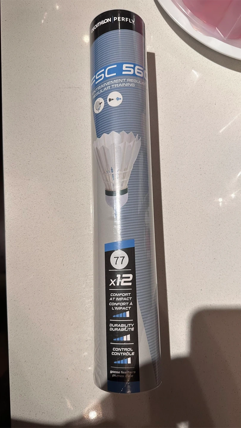 82Selling a tube of Decathlon Perfly FSC 560 badminton shuttlecocks. This tube contains 12 goose feather shuttlecocks, perfect for regular training. They offer comfort at impact and are designed for durability and control on the court