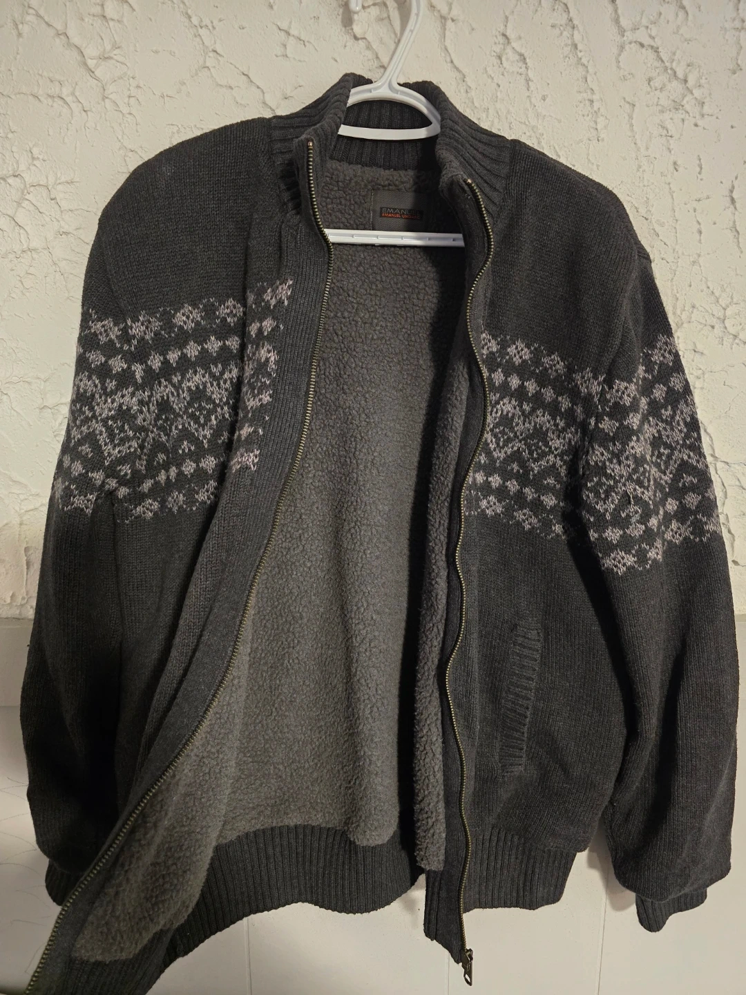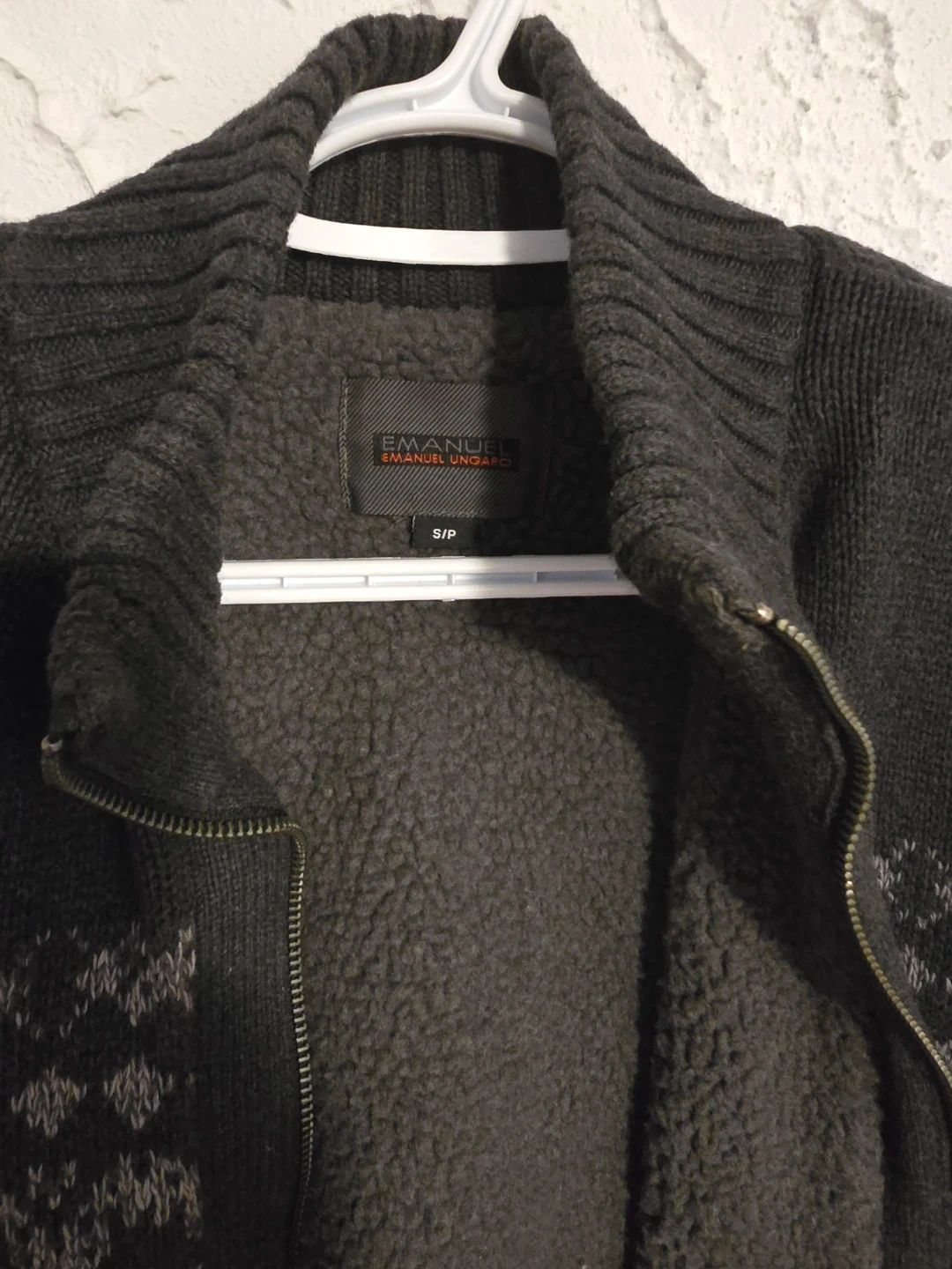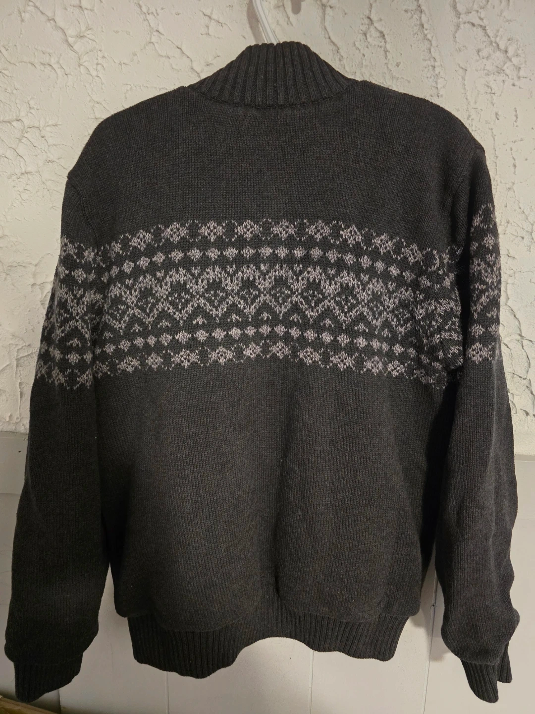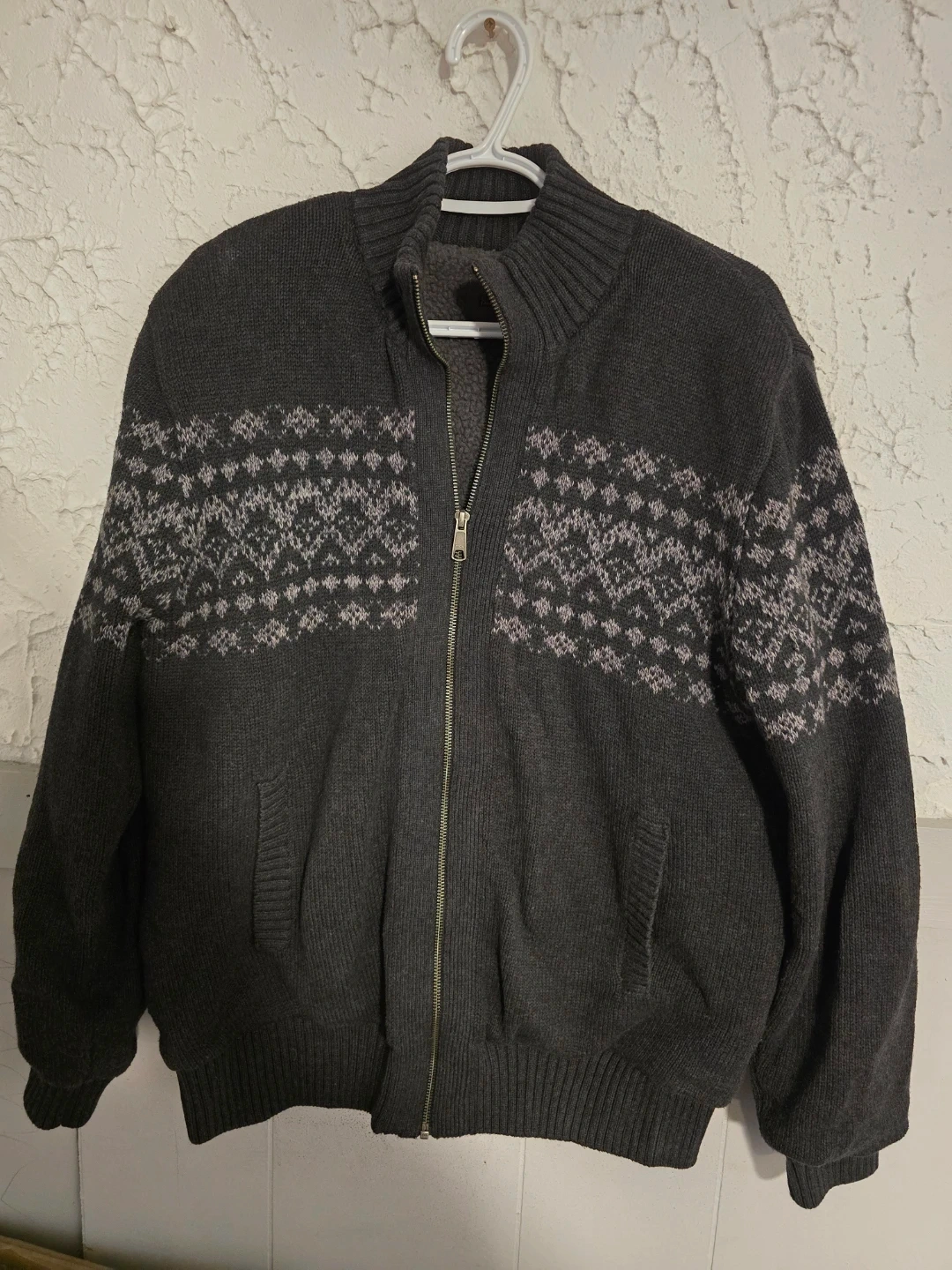 This grey zip-up sweater by Emanuel Ungaro features a classic fair isle pattern. It's lined with soft fleece for added warmth. Perfect for cooler weather! Spb free home in Transcona