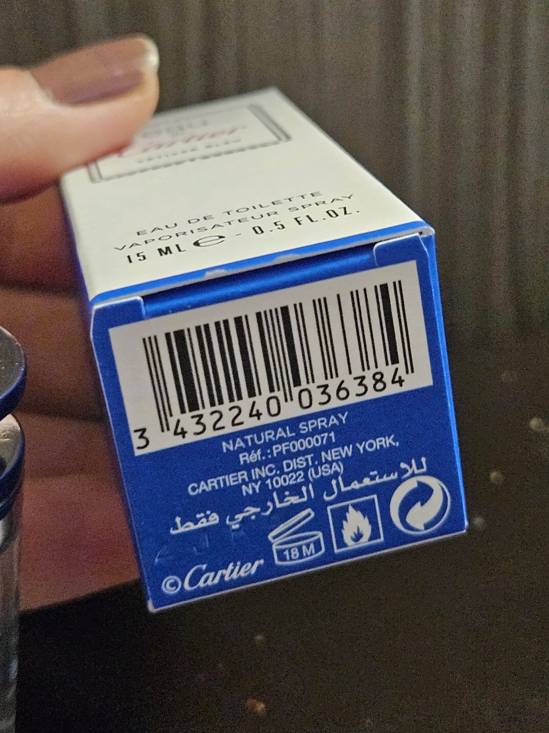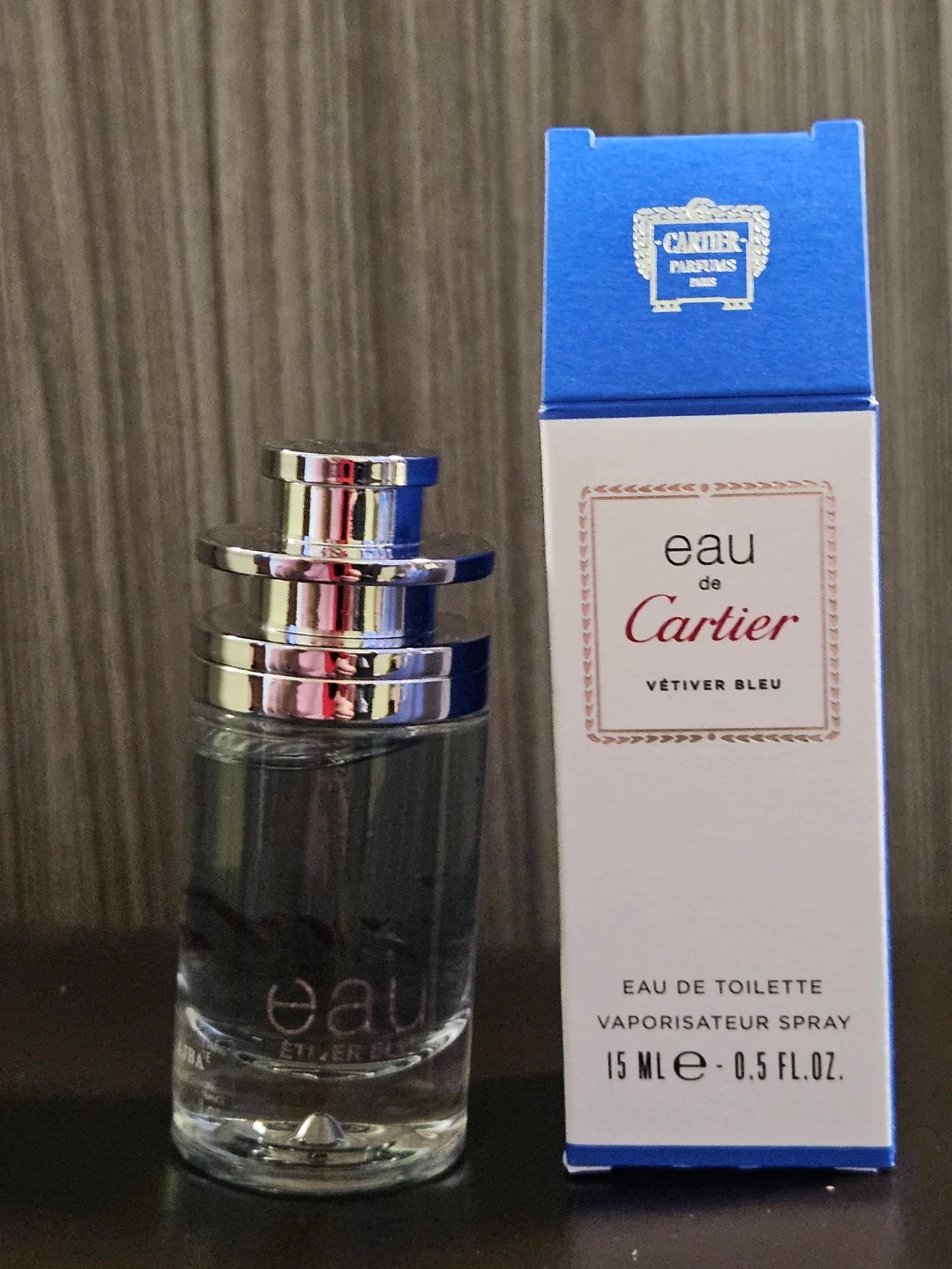 Selling a bottle of Eau de Cartier Vétiver Bleu. This is an eau de toilette vaporisateur spray. The bottle contains 15ml (0.5 fl.oz). Comes with the original box!