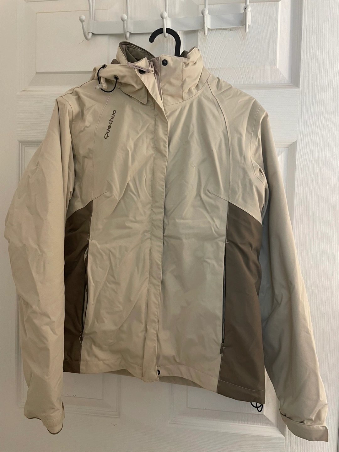 S size. Declathon winter jacket. Unzip and it becomes two separate jackets (raincoat outside and fleece inside). All in one, good for fall, winter, and spring. Pick up near Yonge and finch. Cash only