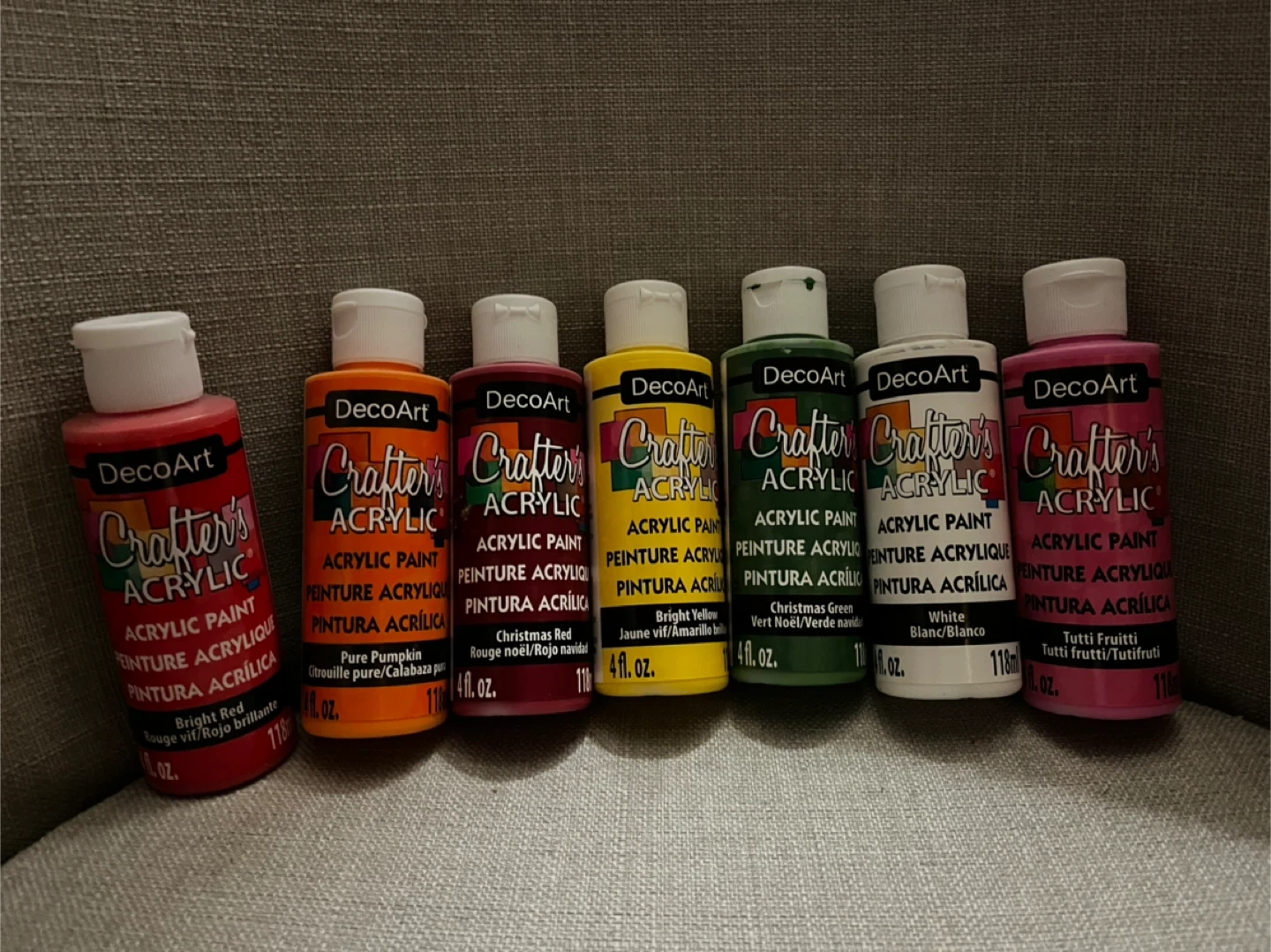1000+š¤Full bottles š¤Each bottle contains 4 fl oz (118 ml) of paint. š¤Colours include Bright Red, Pure Pumpkin, Christmas Red, Bright Yellow, Christmas Green, White, and Tutti Fruitti Pick up only Cash only