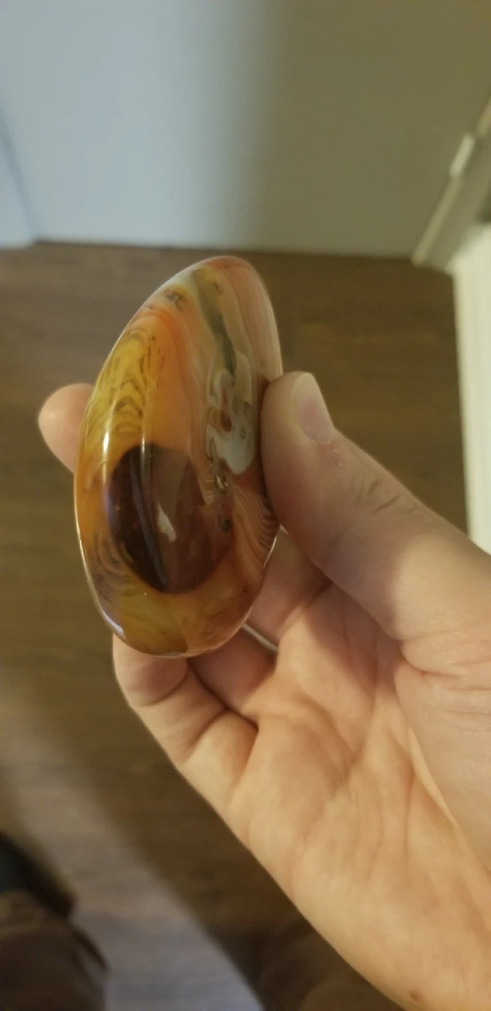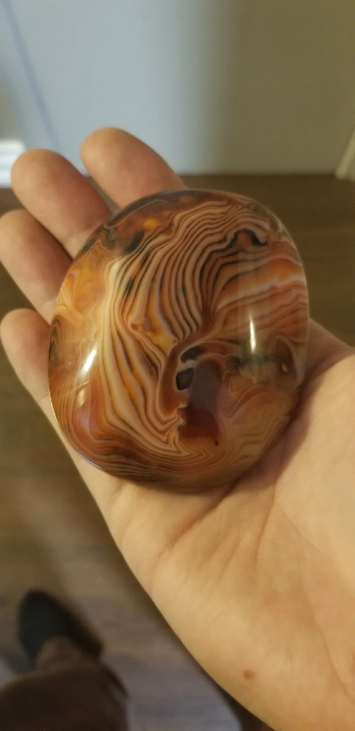 65Here's a beautiful decorative orange swirl agate stone! It has a lovely pattern of orange, brown, and white. It would look great as a paperweight or as part of a collection