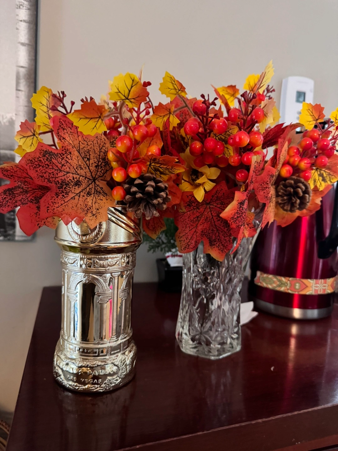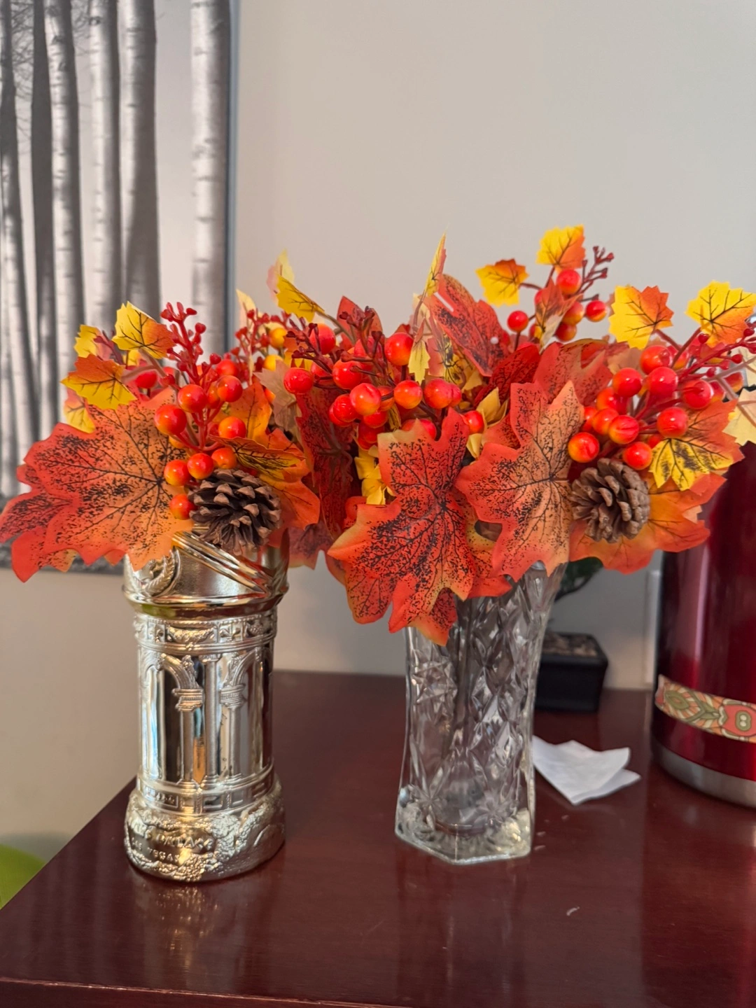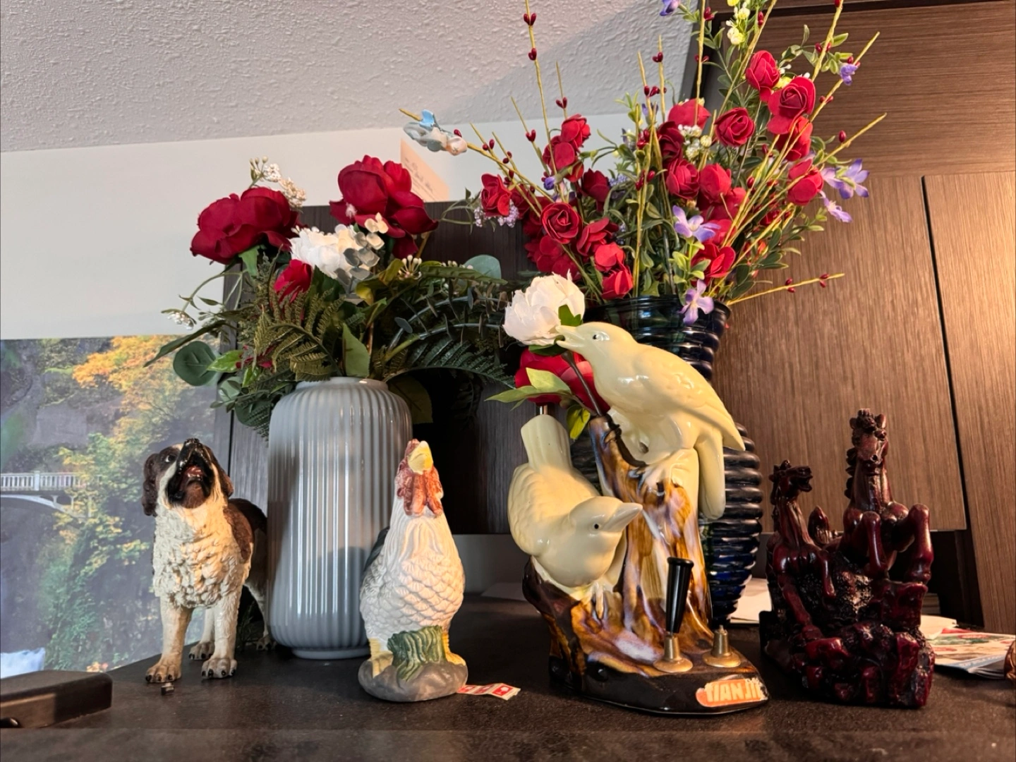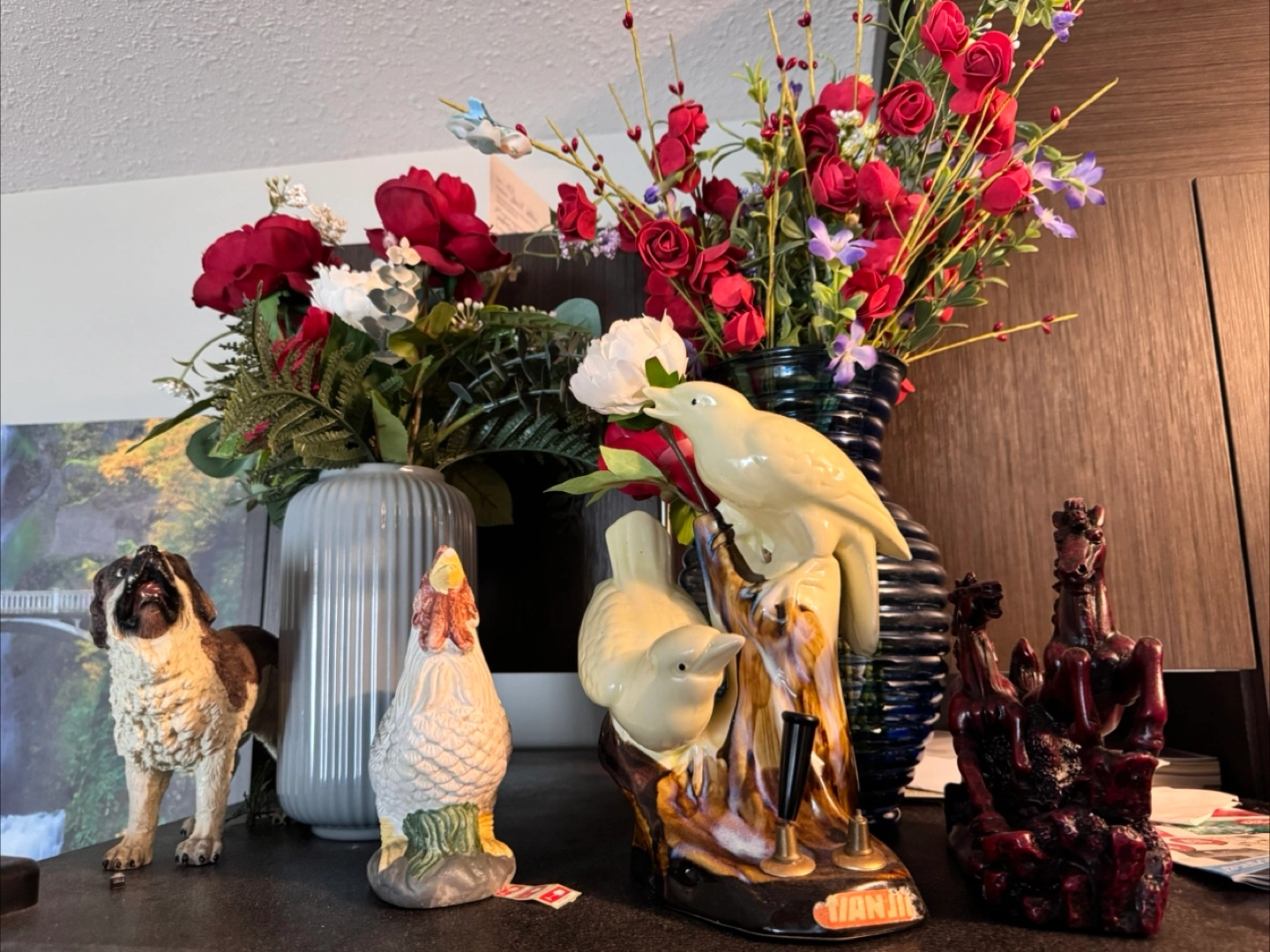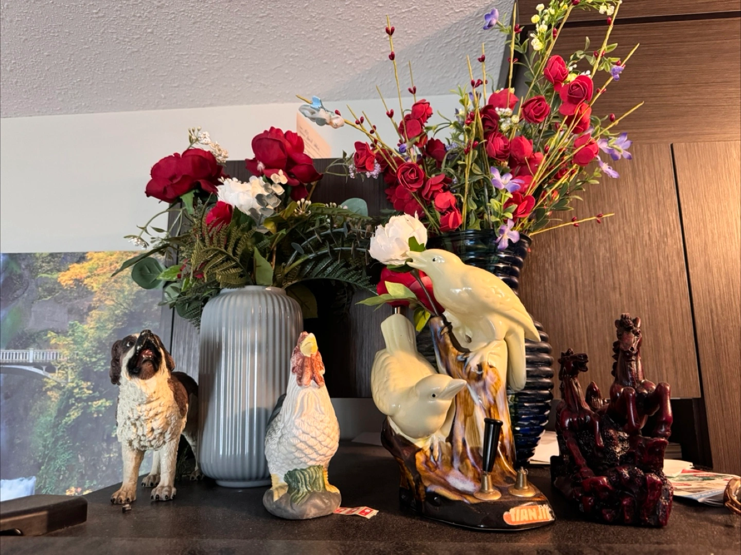 A few decorative artificial flower arrangements to brighten up your space! They're in great shape and would look lovely on a shelf or table all together
