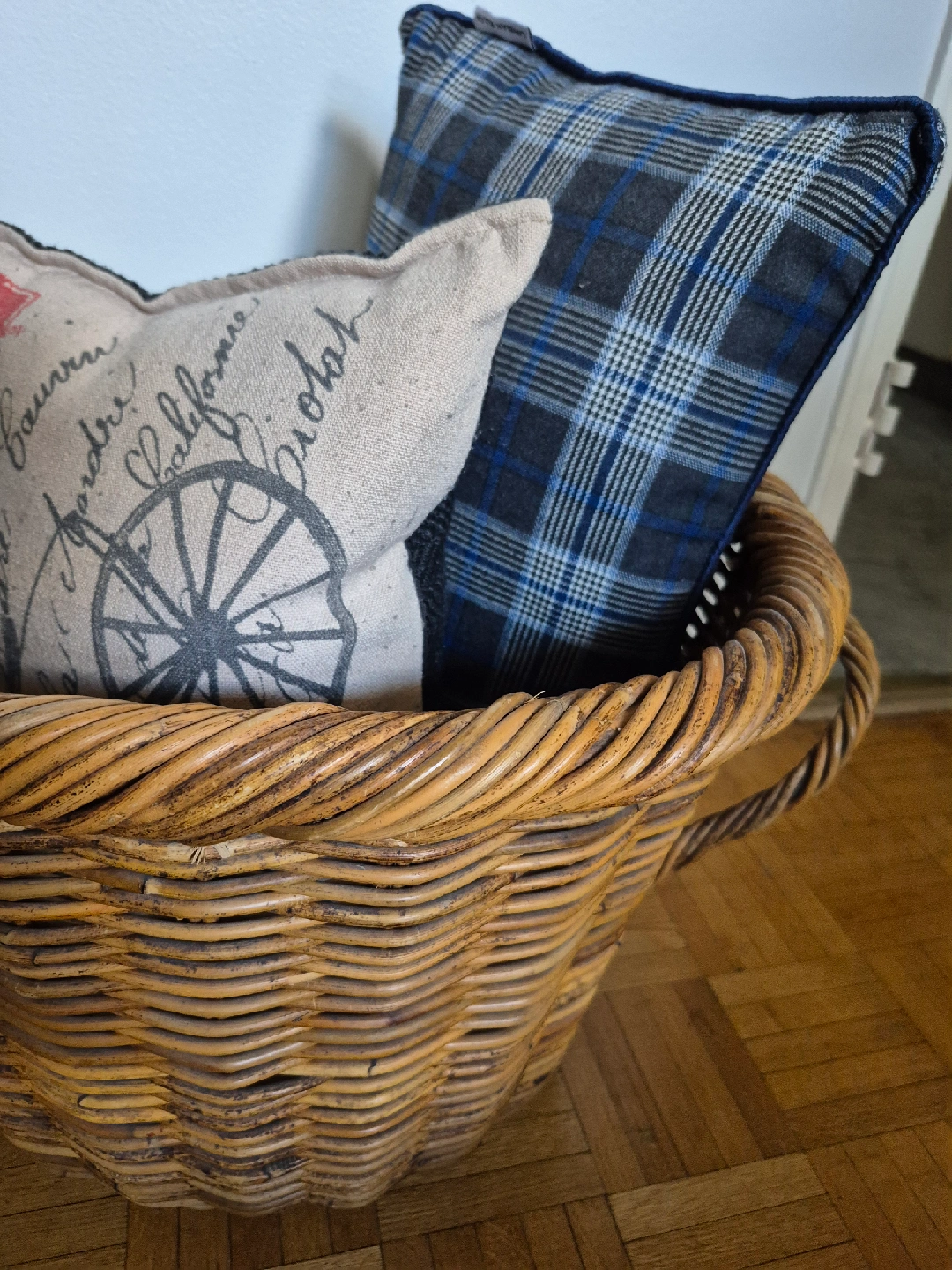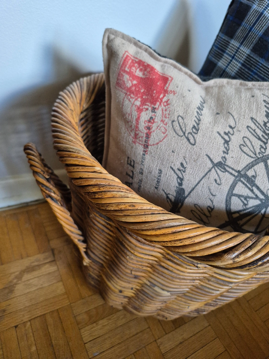 10sturdy wicker basket with handles 14 in high and 20 in long designer cushions included no pets/no smoking/ no bugs $25 cash only Midtown