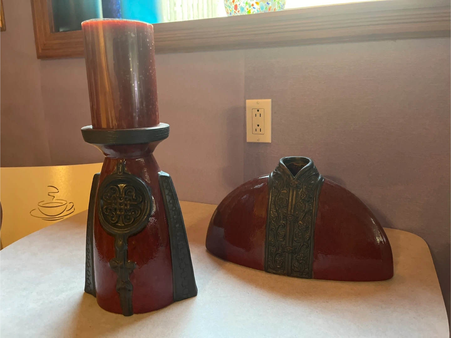 Selling a decorative candle holder and a matching vase. Both are in a deep red colour with intricate detailing. They would look great as a set or separately in any room! Vase 38x22cm Candle holder 32x29cm (candle included)