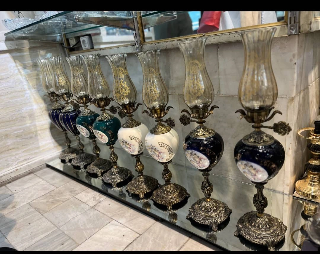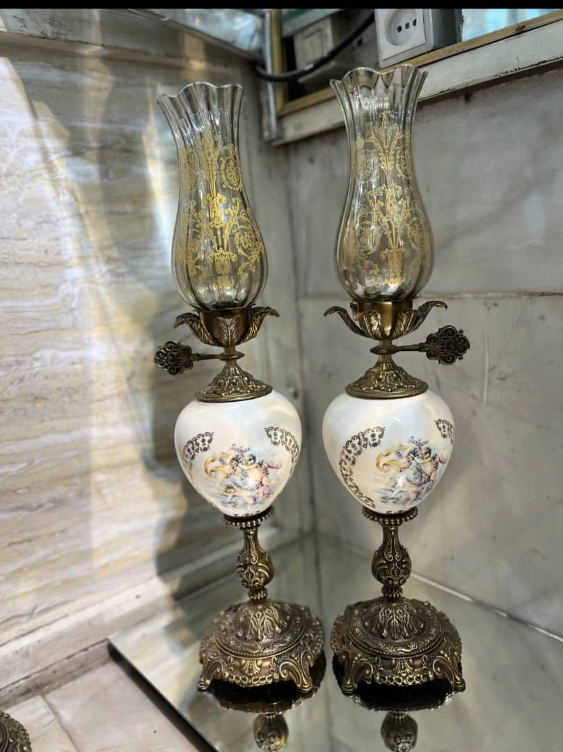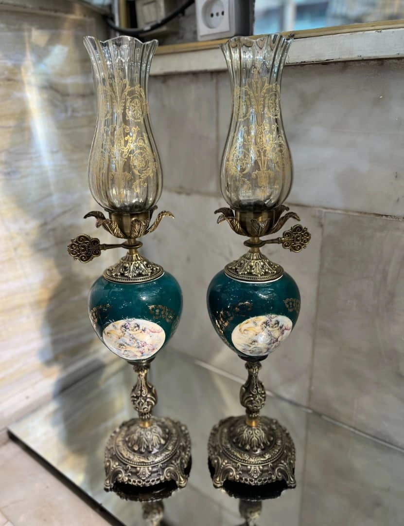 These are beautiful decorative candle holders, perfect for adding a touch of elegance to any room. They feature a glass top with gold detailing and a metal base with intricate designs. The bases come in a variety of colours including dark blue, green and white with cherub designs. These candle holders are in great condition and ready to brighten up your space!