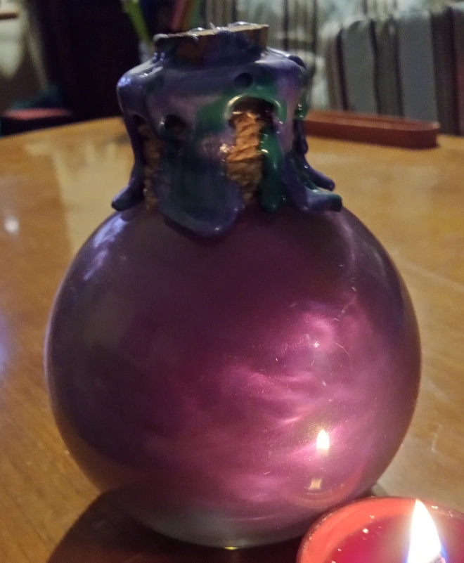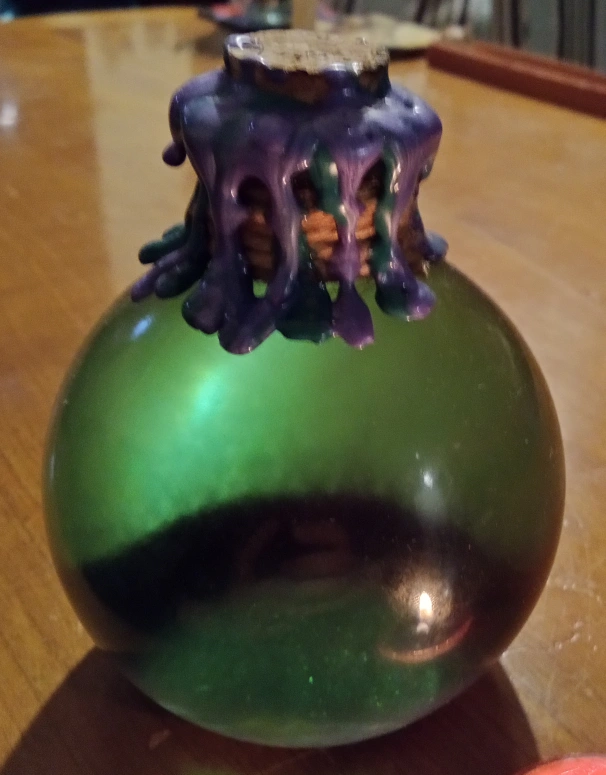 25I have a decorative glass potion bottle that changes color from green to purple. It is sealed with burnt twine and two different waxes.