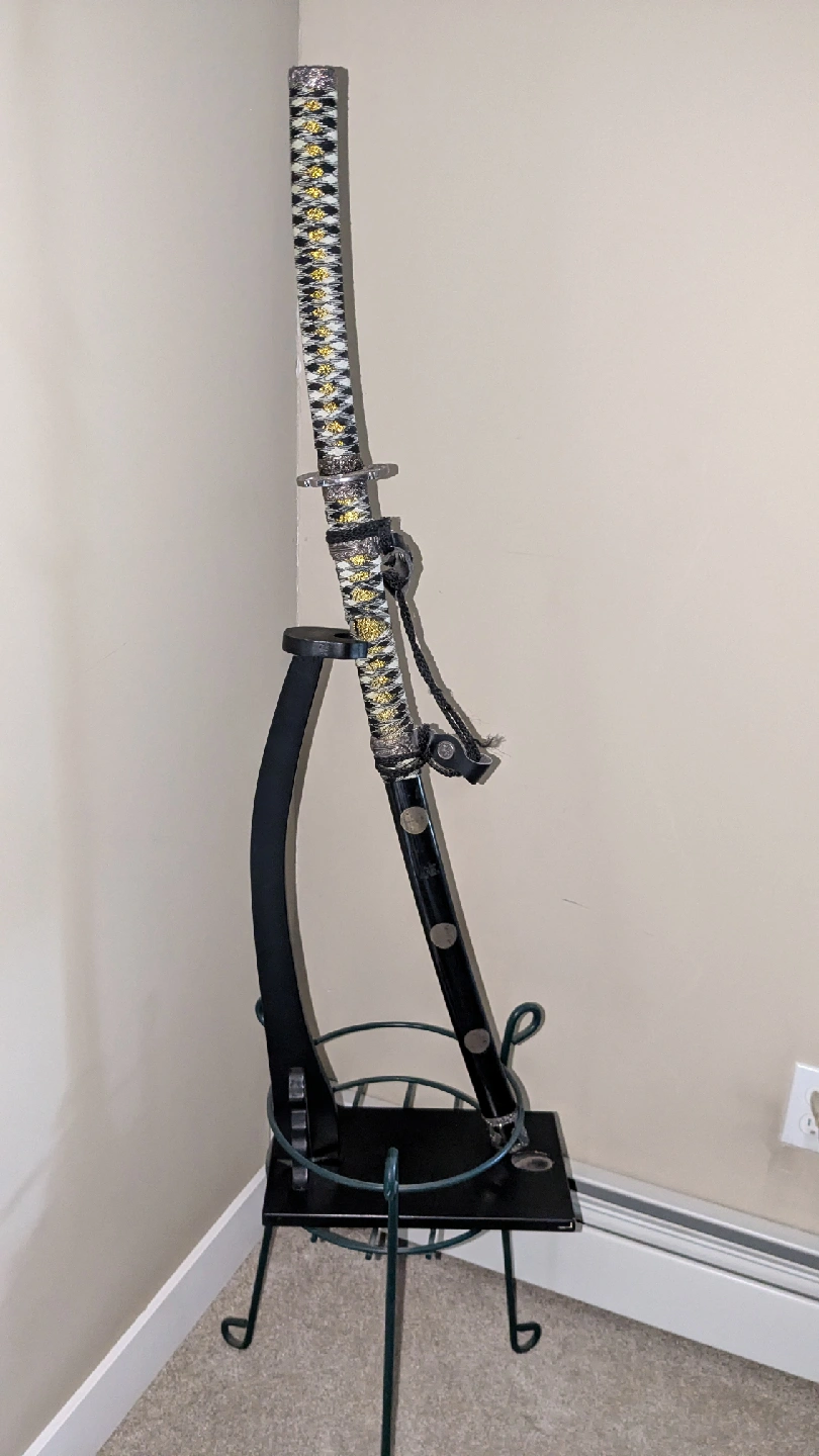 10Selling a decorative katana sword that comes with its own stand. It's a nice piece to add to any collection or to use as a unique decorative item in your home. The sword features intricate detailing on the handle and guard, and the stand is sturdy and complements the sword nicely
