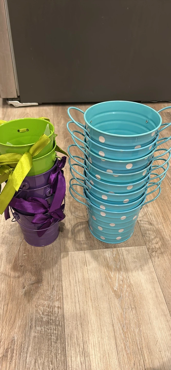 10Selling a collection of mini metal buckets! There are some in turquoise with white polka dots, and others in green and purple with ribbons. Great for decorations or party favours!