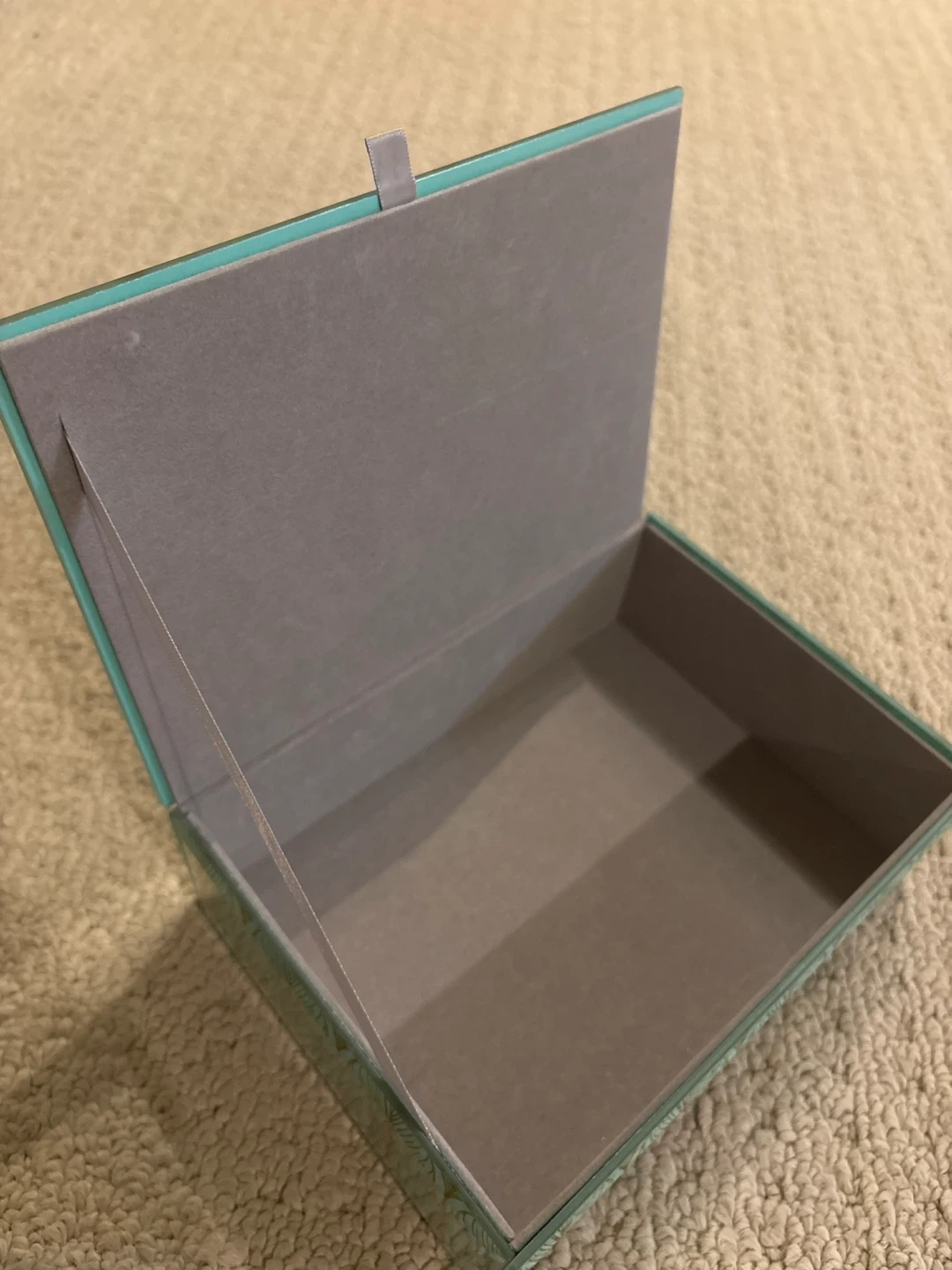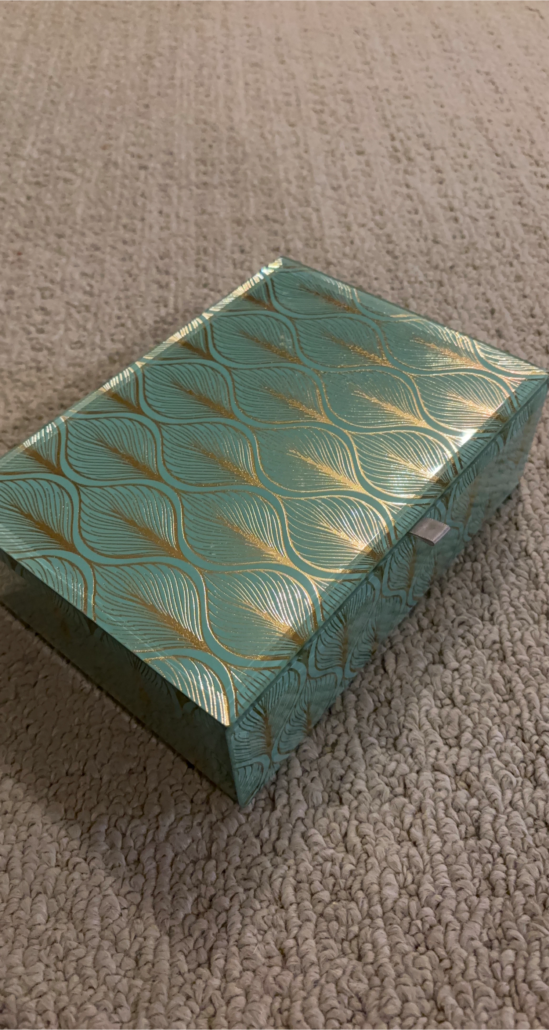 65A lovely decorative box with a mint green background and gold leaf-like patterns. It's in great shape and would be perfect for storing jewelry or other small items. The interior is a soft grey colour. Comes from a smoke-free home