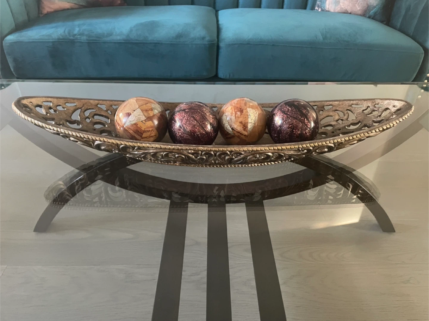 10Selling a set of decorative orbs displayed in an ornate tray. They add a touch of elegance to any room!