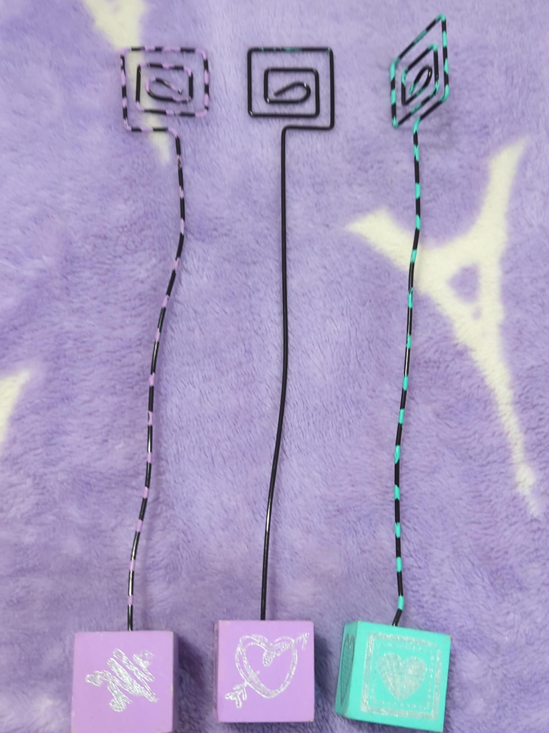 Here's a set of three decorative photo or card holders! They each have a unique design and colour, perfect for adding a personal touch to your space. They feature a cube base and a wire extending upwards to hold your photos or cards