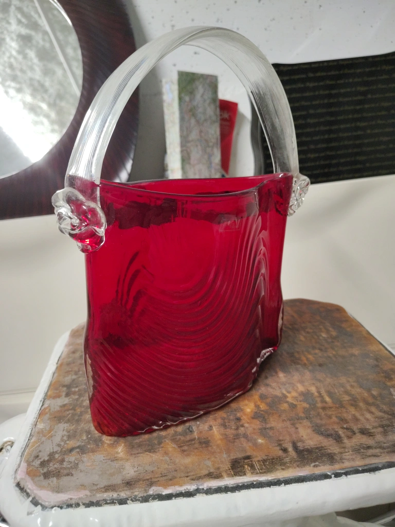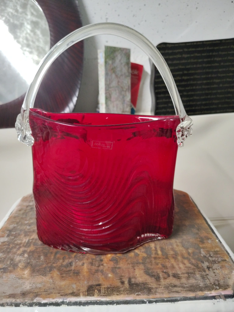 82This is a lovely decorative red glass vase! It has a clear glass handle and a beautiful rippled design on the body. It would look great as a centrepiece or as a unique accent in any room