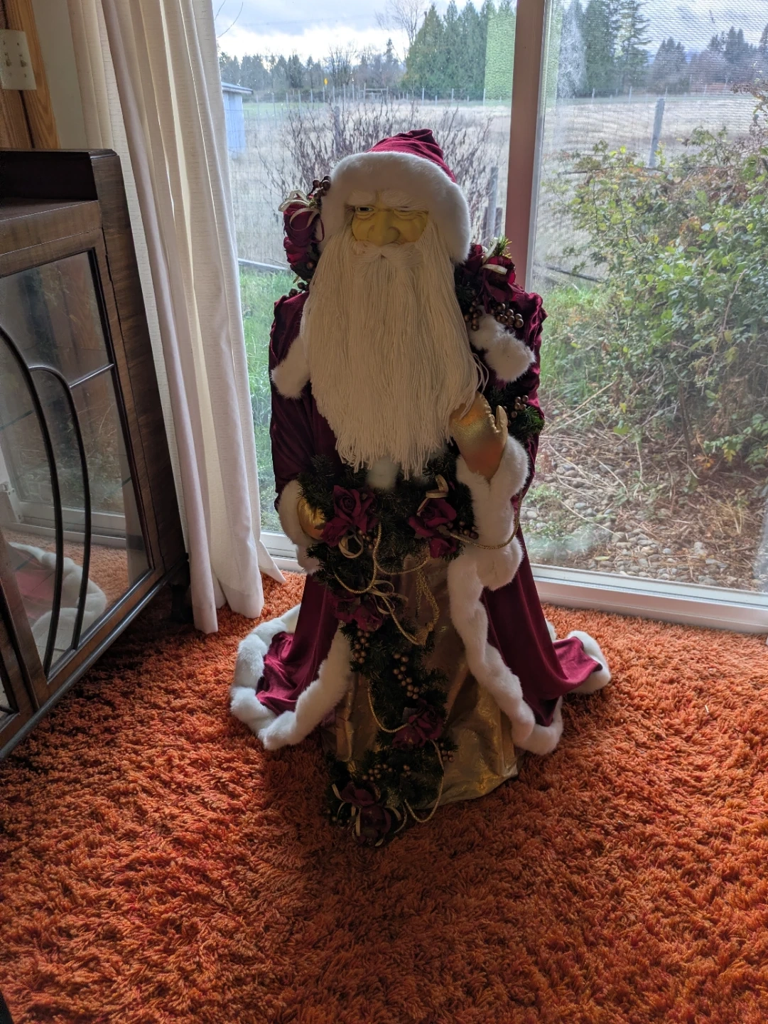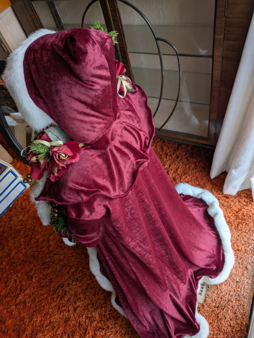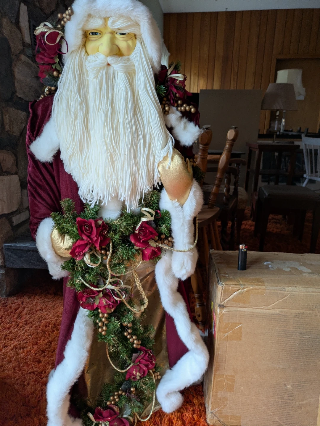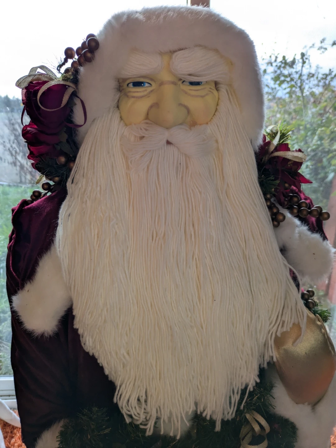 10A festive Santa Claus figure, perfect for holiday decorating! It features a long white beard, a red velvet outfit with white trim, and decorative floral accents. It's in great condition and ready to bring some Christmas cheer to your home