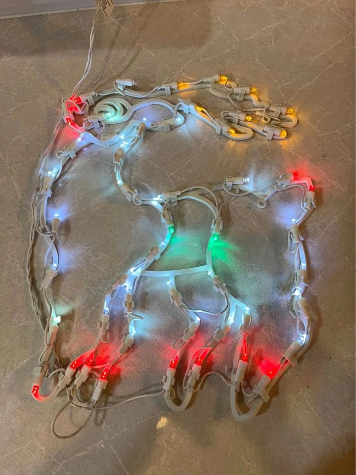 Decorative silhouette Christmas reindeer, about 13”x15”. One light needs replacing.
