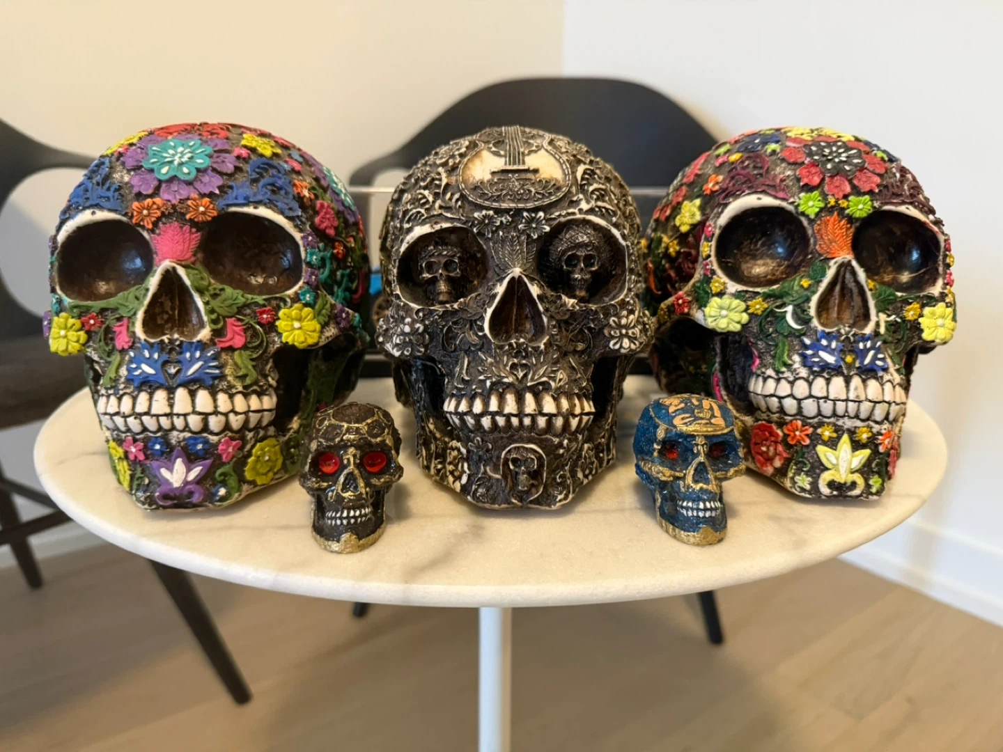 19I'm selling a set of decorative skulls. They are in great condition and would be a unique addition to any home! The set includes three large skulls and two smaller ones, all with intricate designs and vibrant colours.