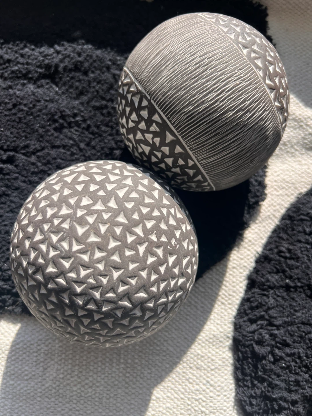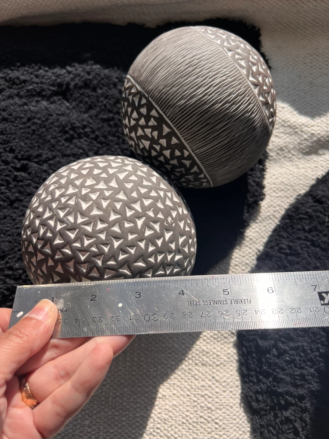 13Selling two ceramic decorative spheres with intricate patterns! They're black and white and would look great on any shelf or table. The ruler in the picture shows they're about 4 inches in diameter. They have a nice texture and add a unique touch to any room