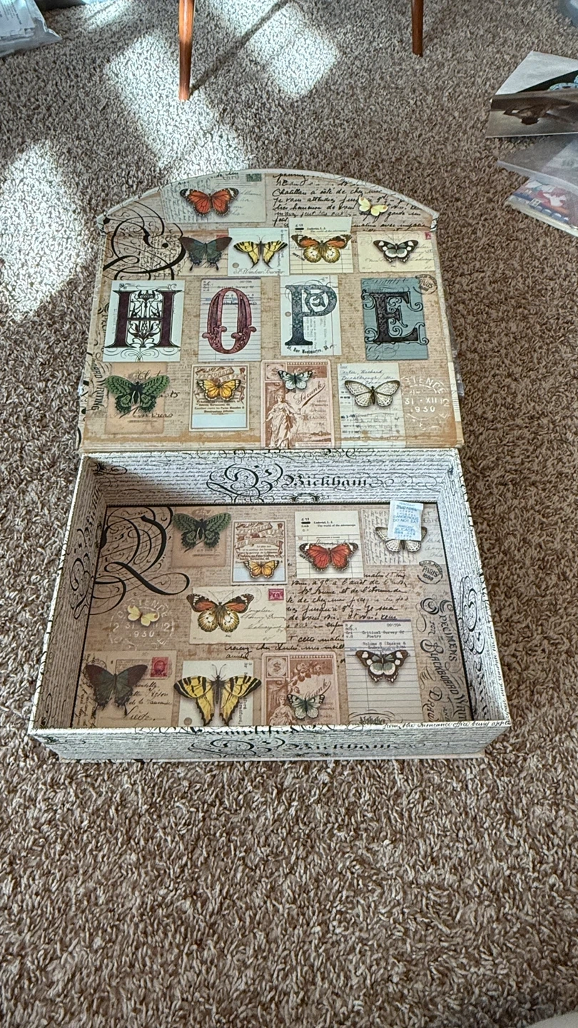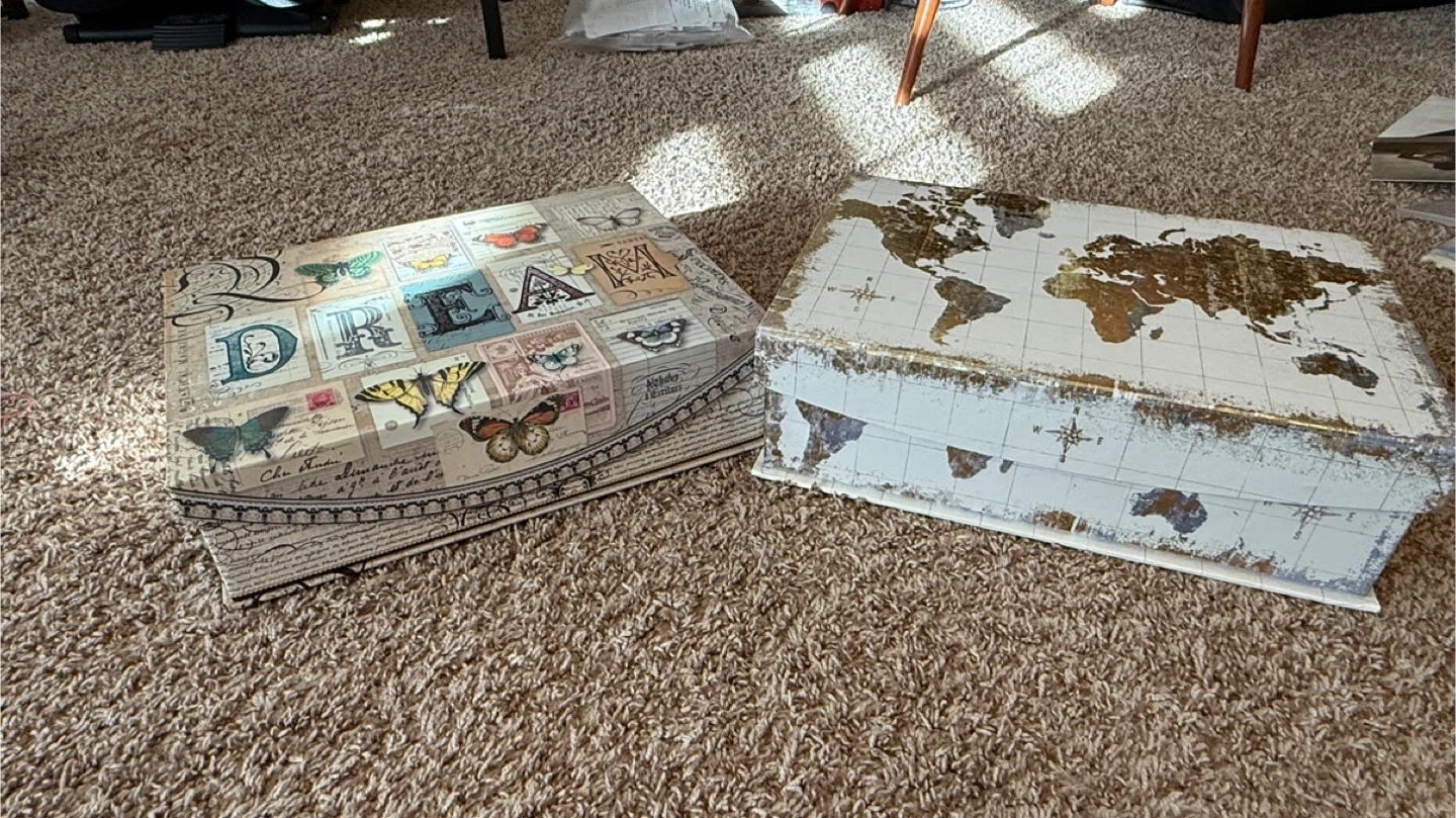 Selling a set of two decorative storage boxes. One has a world map design and the other has a butterfly and 'DREAM' theme. They're great for adding a touch of style while keeping things organized! Dimensions: 13 x 9 x 4 inches. PLEASE NOTE: Pickup in Tuscany area. Cash preferred. E-transfer to hold. Please send me a message with date/time to pickup.