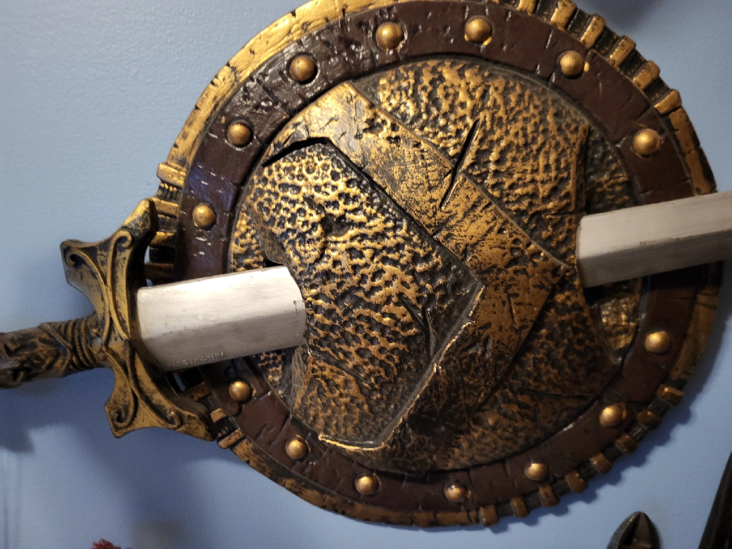 60Selling a decorative sword and shield set! It's a unique piece that would look great as wall decor or part of a collection. The shield has a cool, textured design with a bronze and brown finish, and the sword fits right through the middle. Adds a touch of medieval flair to any room