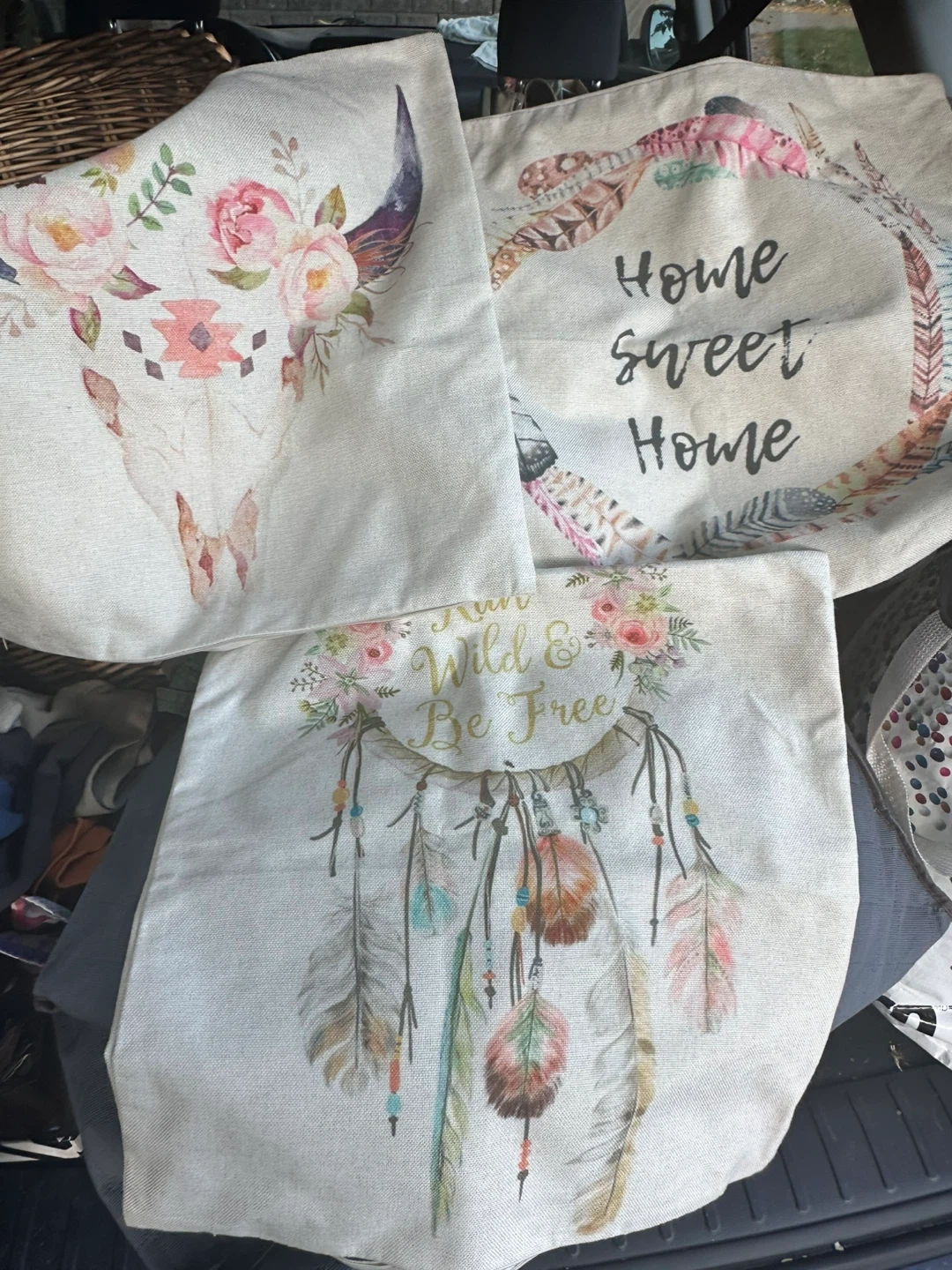 Selling a set of three decorative throw pillow covers! They feature unique designs: one with a floral bull skull, another with a 'Home Sweet Home' wreath, and the last with a 'Run Wild & Be Free' dreamcatcher design. Perfect for adding a touch of boho charm to your living space