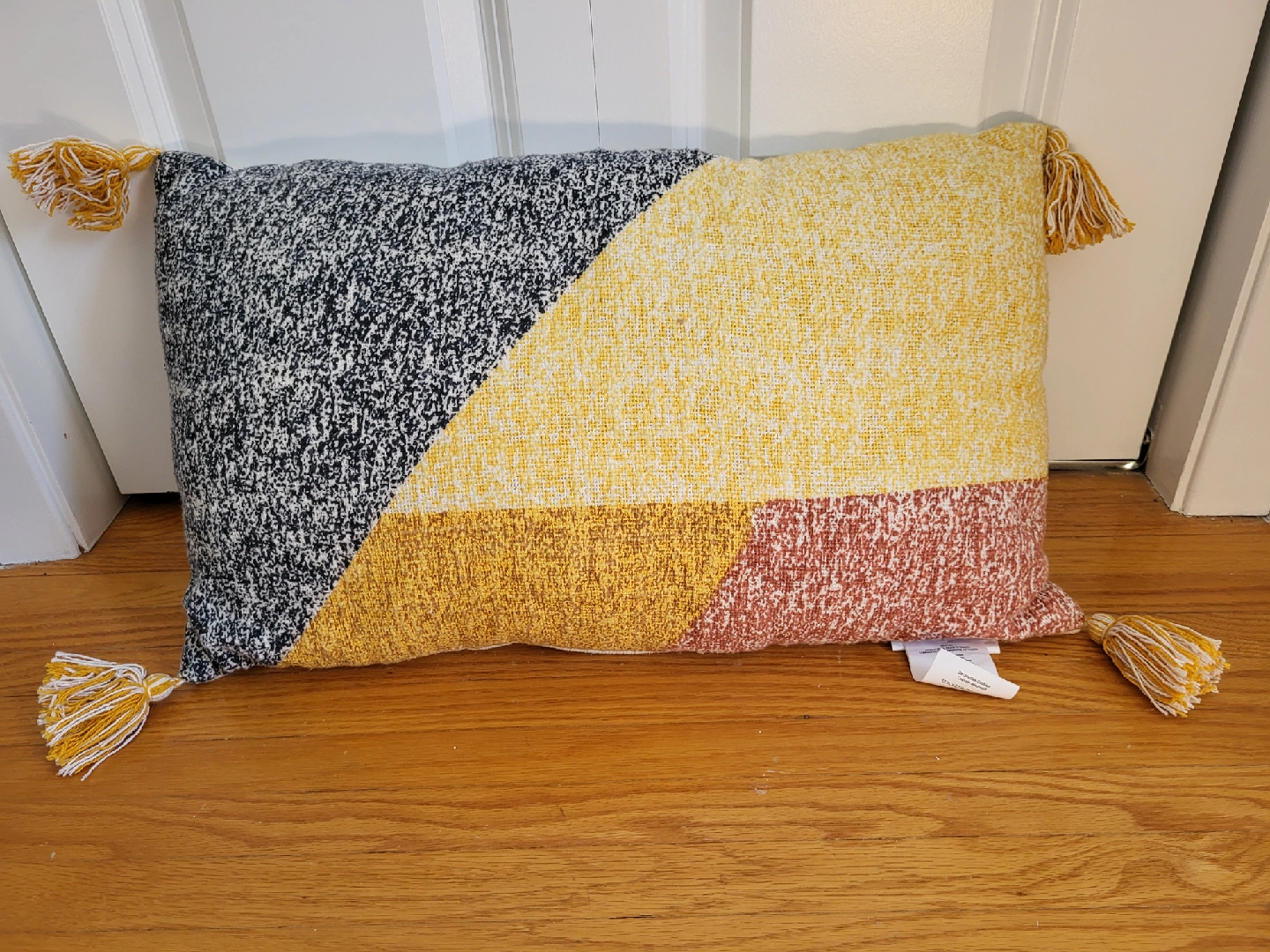 10Add a pop of colour to your living space with this decorative throw pillow! It features a geometric design in shades of black, yellow, and terracotta, and fun tassels on each corner. Perfect for adding a touch of texture and style to your couch or bed
