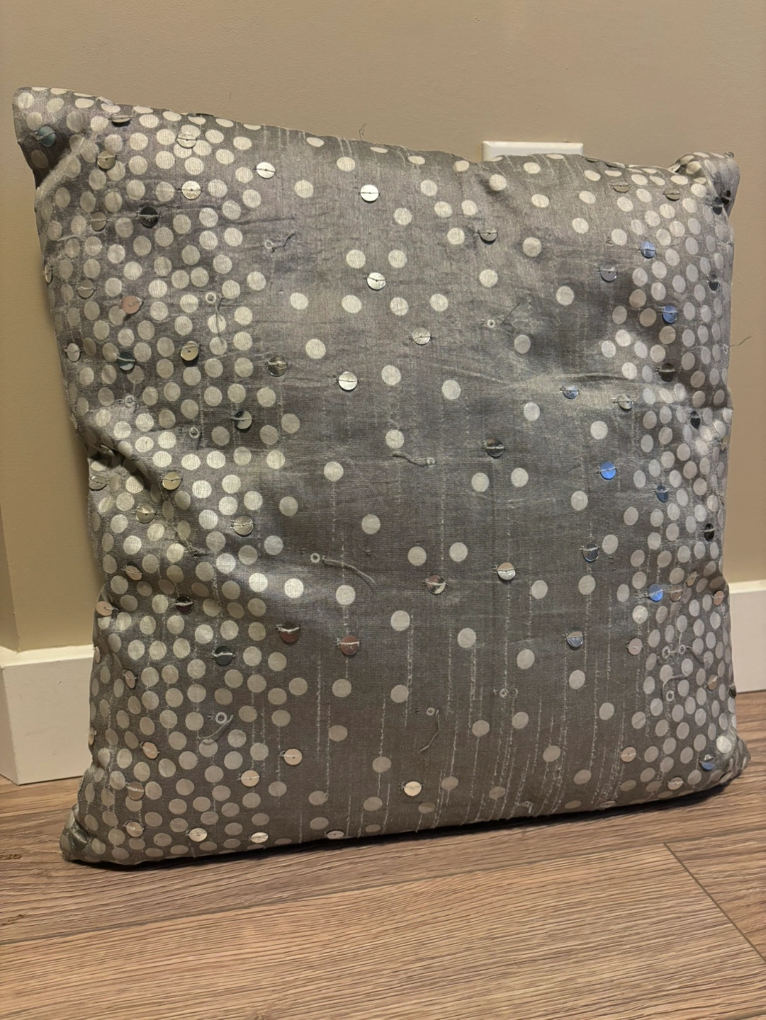 300Silver, filled cushion made of polyester with pretty sequin detail, reversible sides. I’m downsizing a lot of my textiles and decor items so please check out my other listings if you’re interested! Located in Ellerslie, e-transfer and porch pickup only