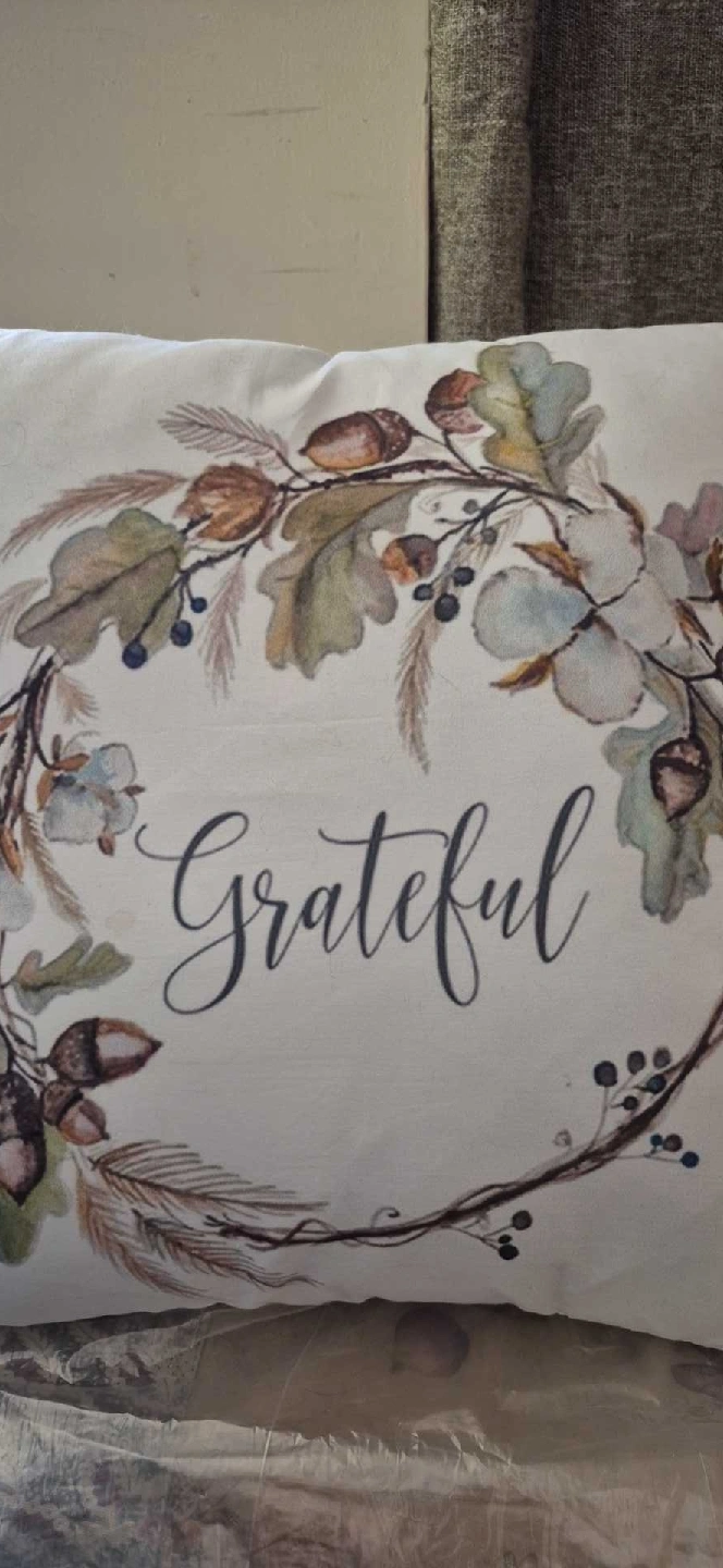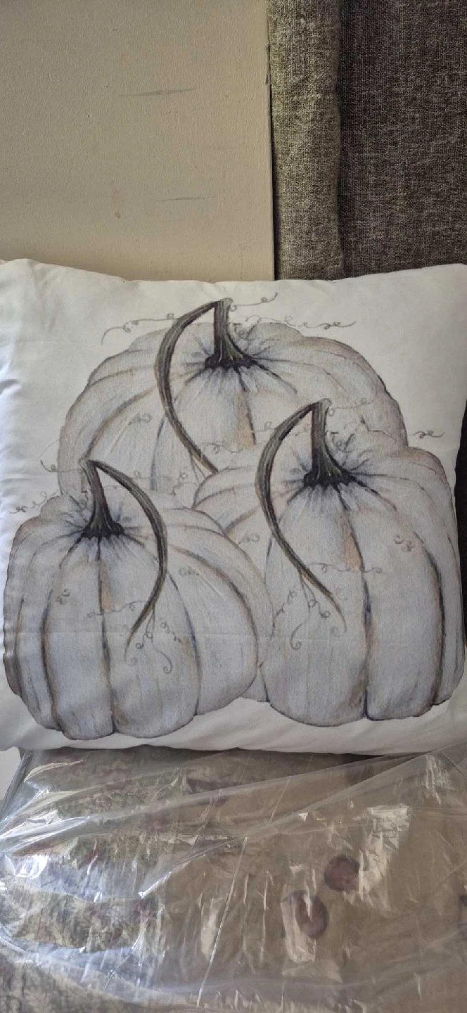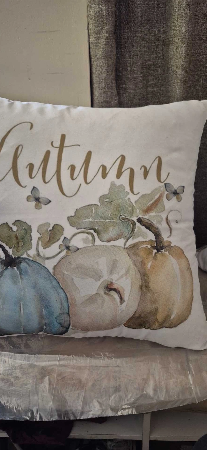 15These are some decorative throw pillows with different autumn themes. One says "Grateful", another has white pumpkins, and the third has an "Autumn" theme with coloured pumpkins. They'd be perfect for adding a cozy touch to your home!