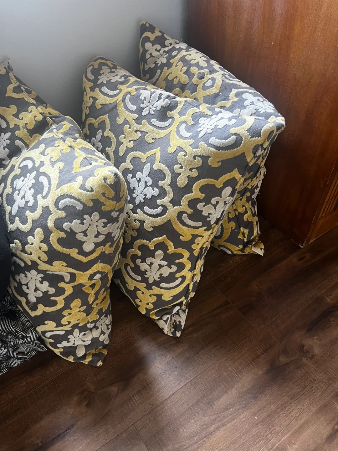 Selling a set of decorative throw pillows with a grey and gold pattern. They would look great on a couch or bed! They are in good condition and ready for a new home