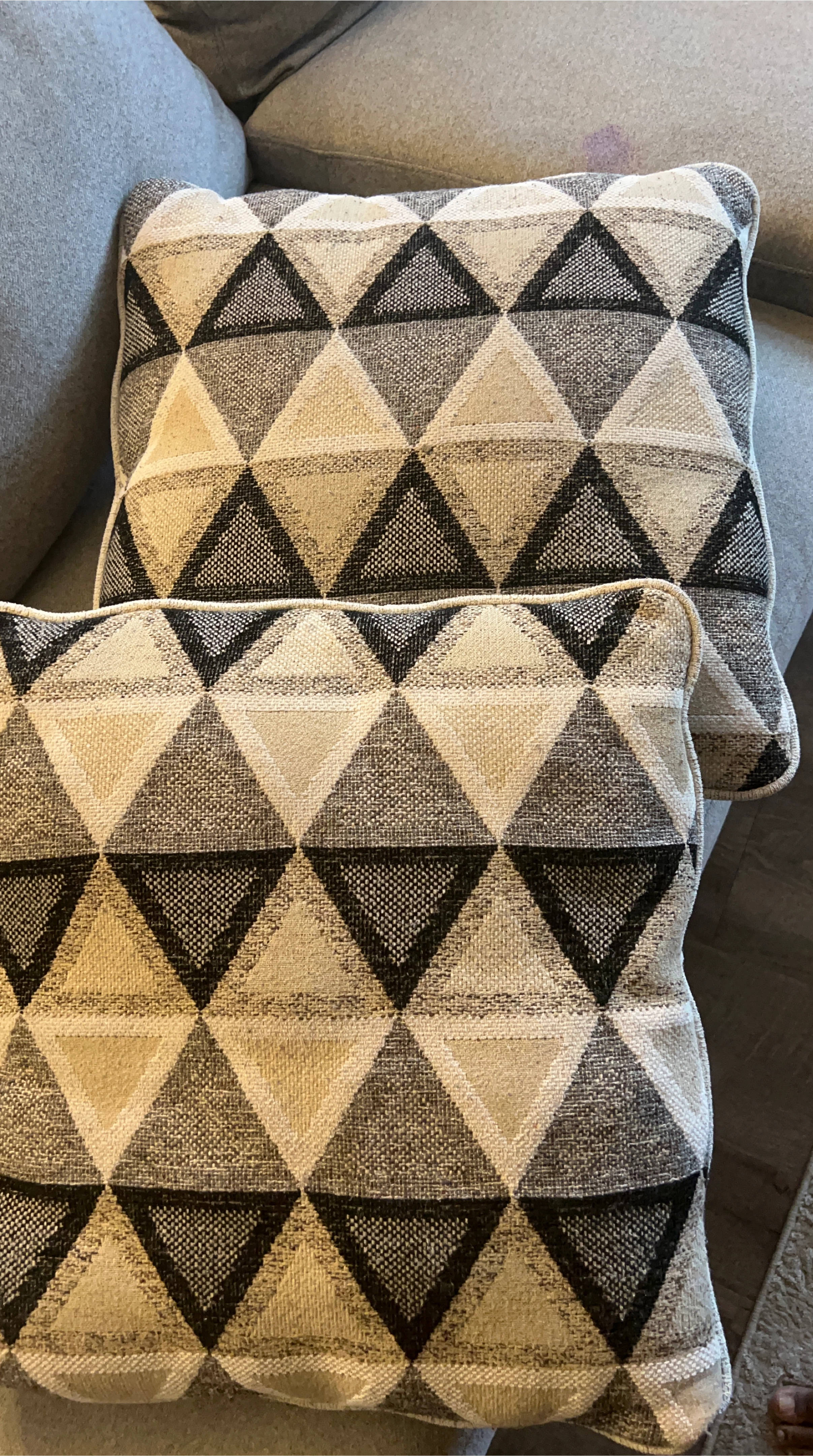 Selling a set of two decorative throw pillows. They feature a geometric triangle pattern in shades of beige, grey, and black. They're in good condition and would be a great addition to any living room or bedroom!
