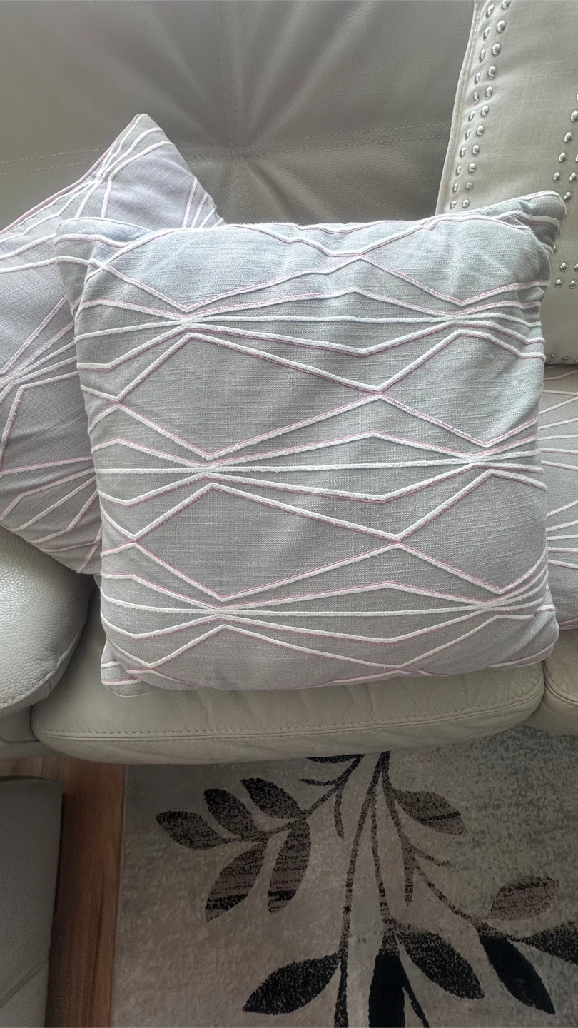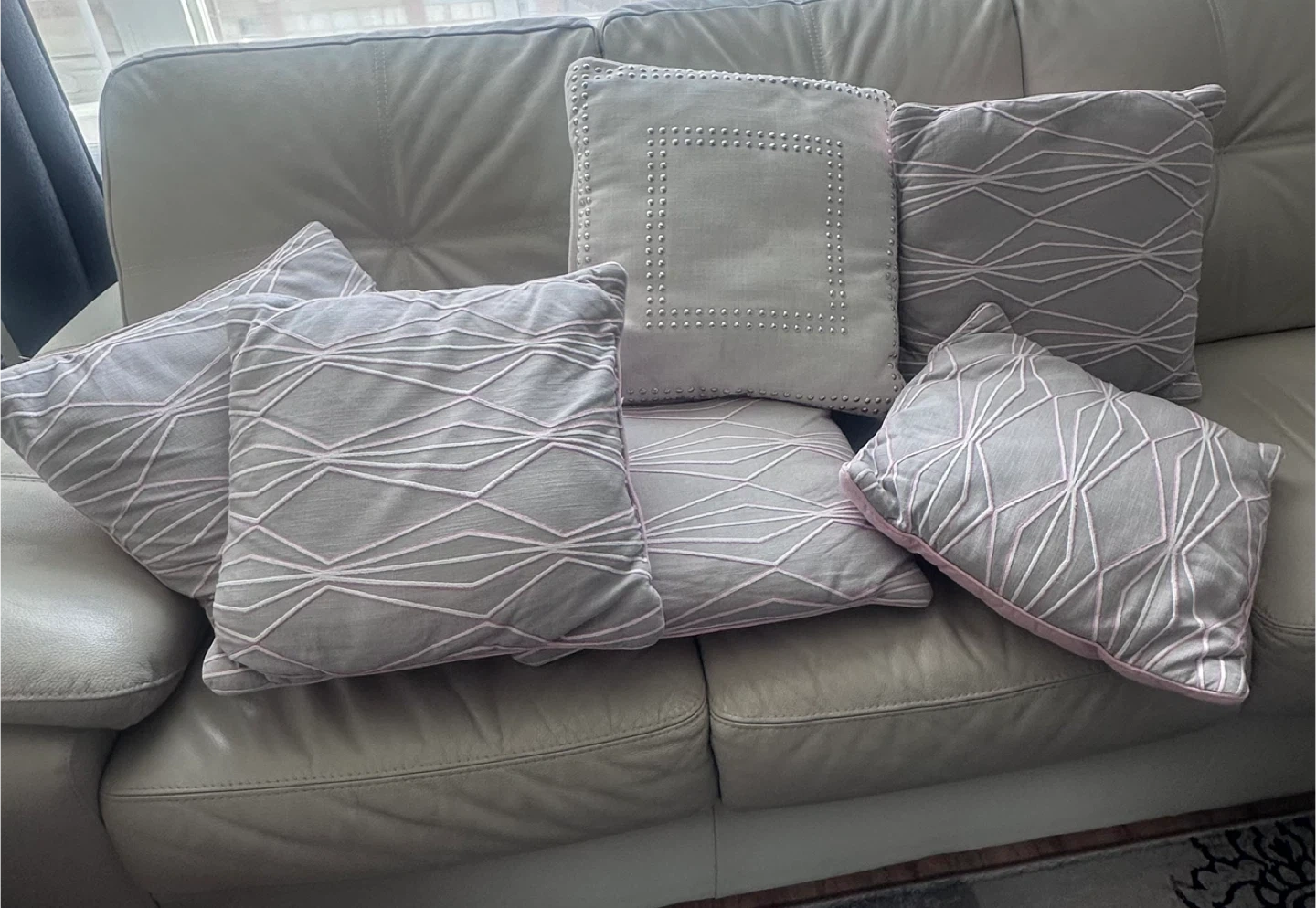 Selling a set of six decorative throw pillows. They're in great shape and would look lovely on a couch or bed. There are two different designs, one with a geometric pattern and the other with silver studs. Perfect for adding a touch of style to your living space!