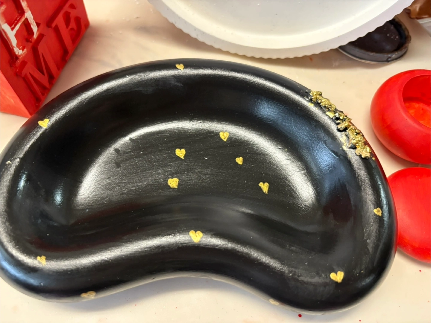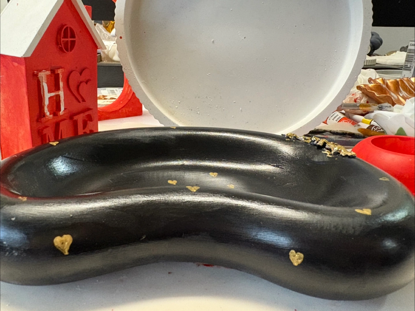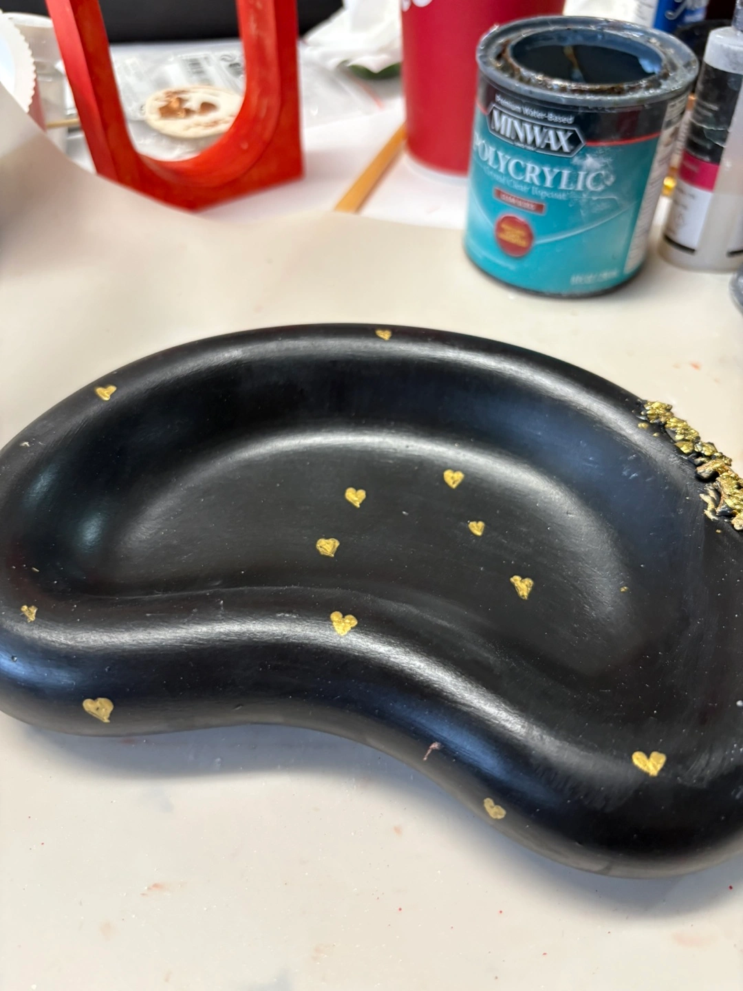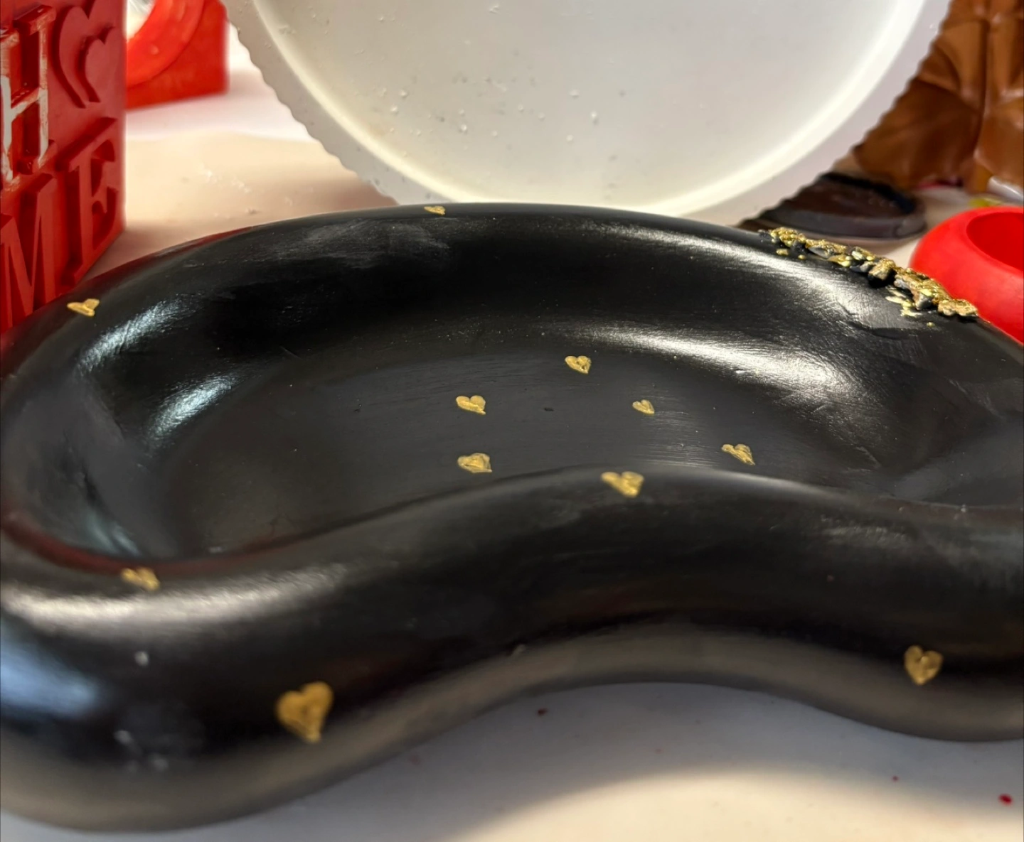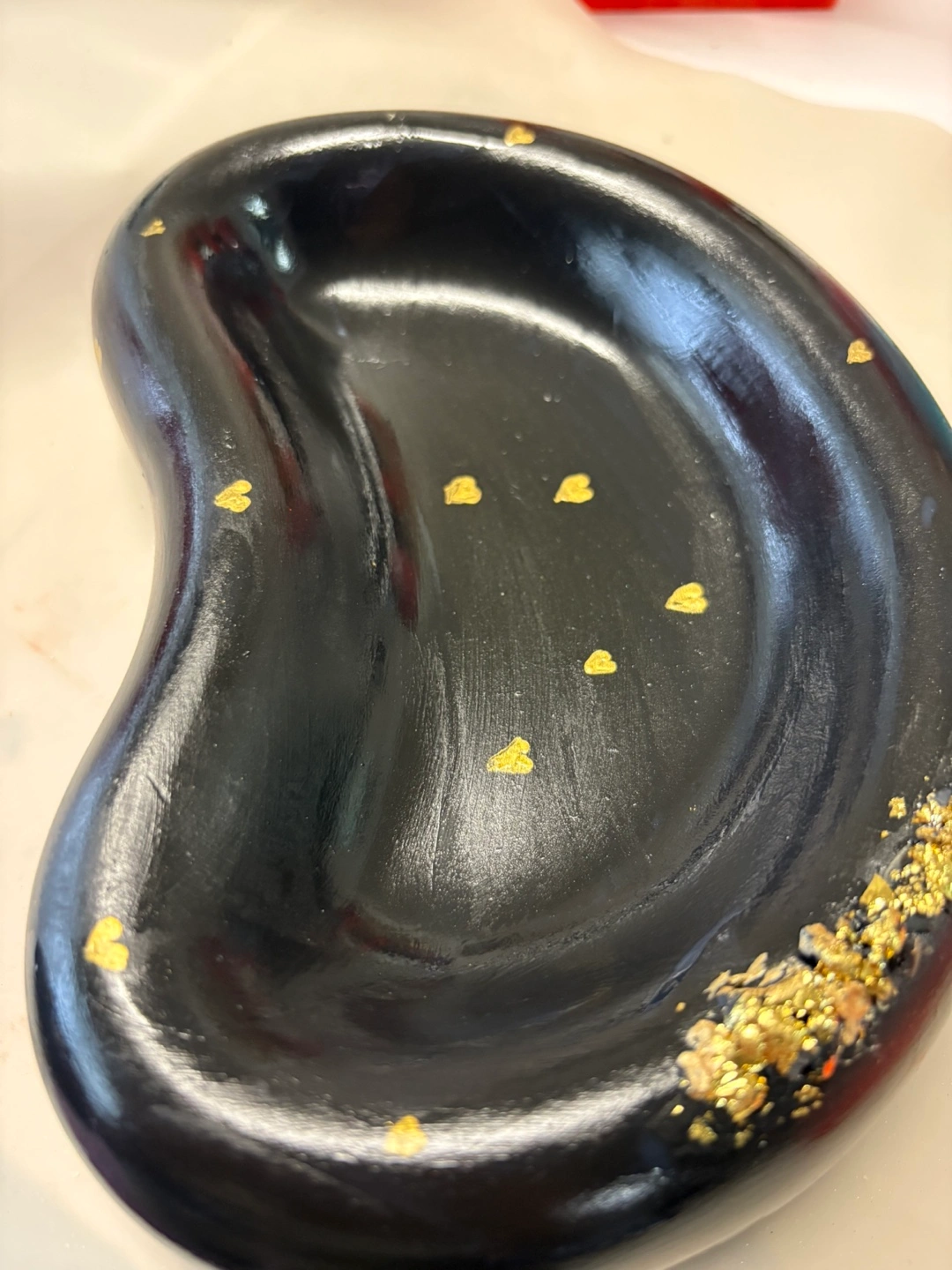 Add a touch of modern elegance and handcrafted charm to your space with this unique black and gold heart Jesmonite tray. Lovingly handmade, this eye-catching piece features a sleek black base adorned with delicate gold hearts and a textured gold accent along one edge. More than just a beautiful decorative item, this versatile tray is also functional. Use it as a stylish trinket tray on your entryway table for keys and small essentials, a chic jewelry holder on your dresser, or a modern decorative accent on your coffee table. Crafted from durable and eco-friendly Jesmonite, each dish has a smooth, tactile finish and a substantial feel. The contrast between the deep black and the shimmering gold creates a luxurious and contemporary aesthetic that complements any home decor style. This handmade tray makes a thoughtful gift for housewarmings, birthdays, anniversaries, or just because! Tags: