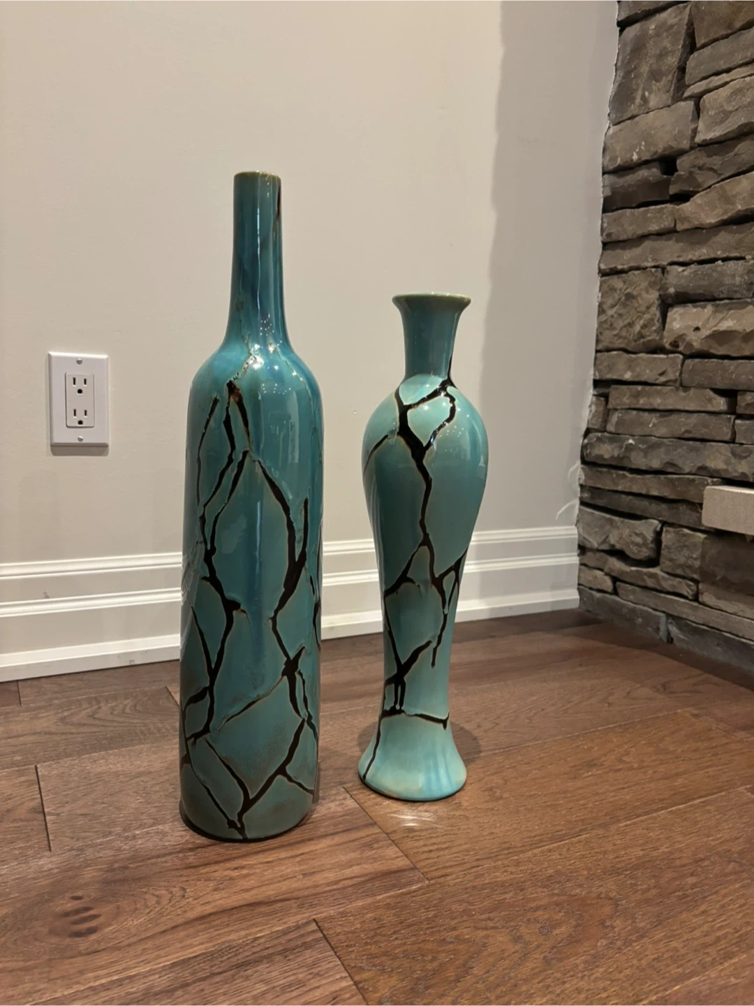 Add a touch of elegance to your home with these lovely turquoise vases! Buy as a set or separately and feature a unique, eye-catching design. Perfect for displaying flowers or as standalone decorative pieces to enhance any room's decor. $30 for the pair