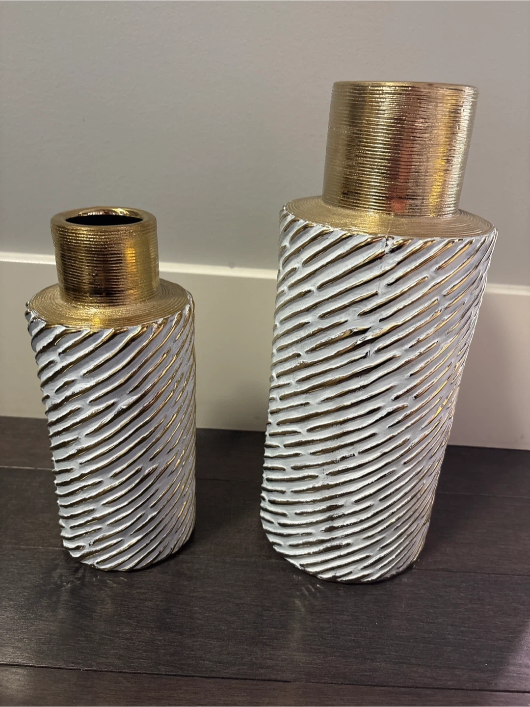 10Selling a set of two decorative vases. They feature a stylish gold and white design. Perfect for adding a touch of elegance to any room