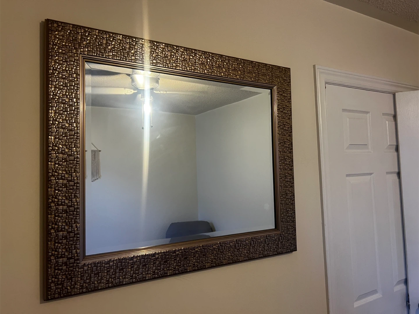 65This is a lovely decorative wall mirror. It has a unique patterned frame that would look great in any room of the house. It's in great condition and ready to find a new home! 35 inches x 29 inches
