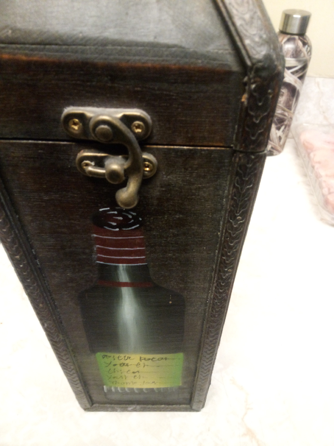 Selling a decorative wooden box. It features a unique design with a bottle painted on the front. It could be used for storage or as a decorative piece in your home
