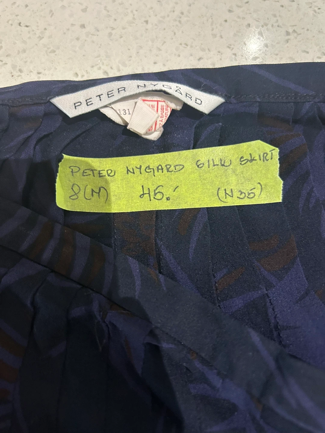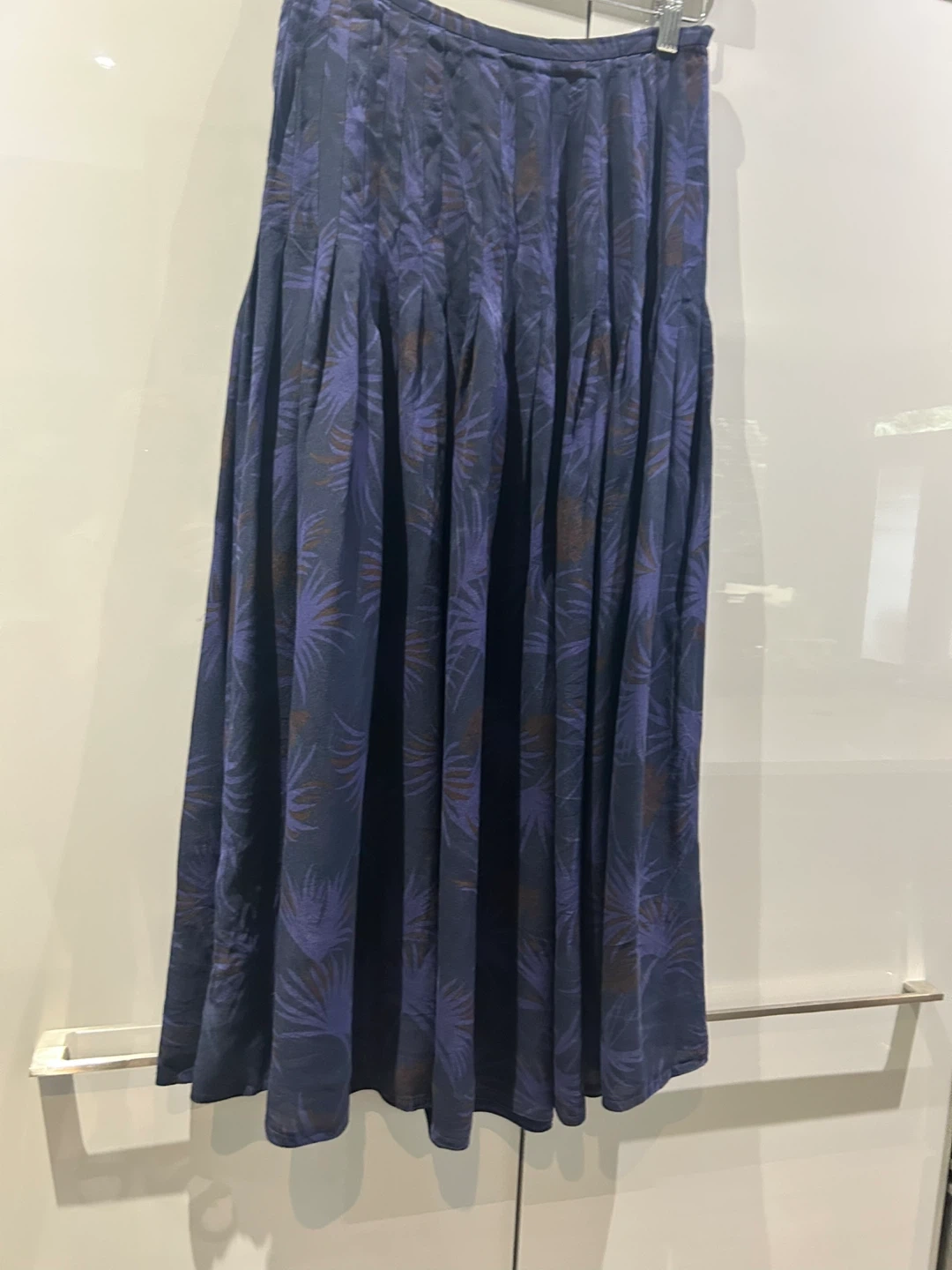 This Peter Nygard skirt is made of 100% silk. It features a dark navy base with a blue and brown palm leaf print. The skirt has a pleated design and hits around midi length.