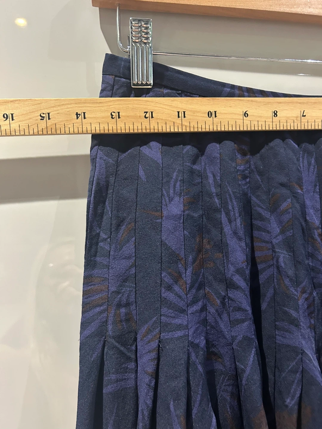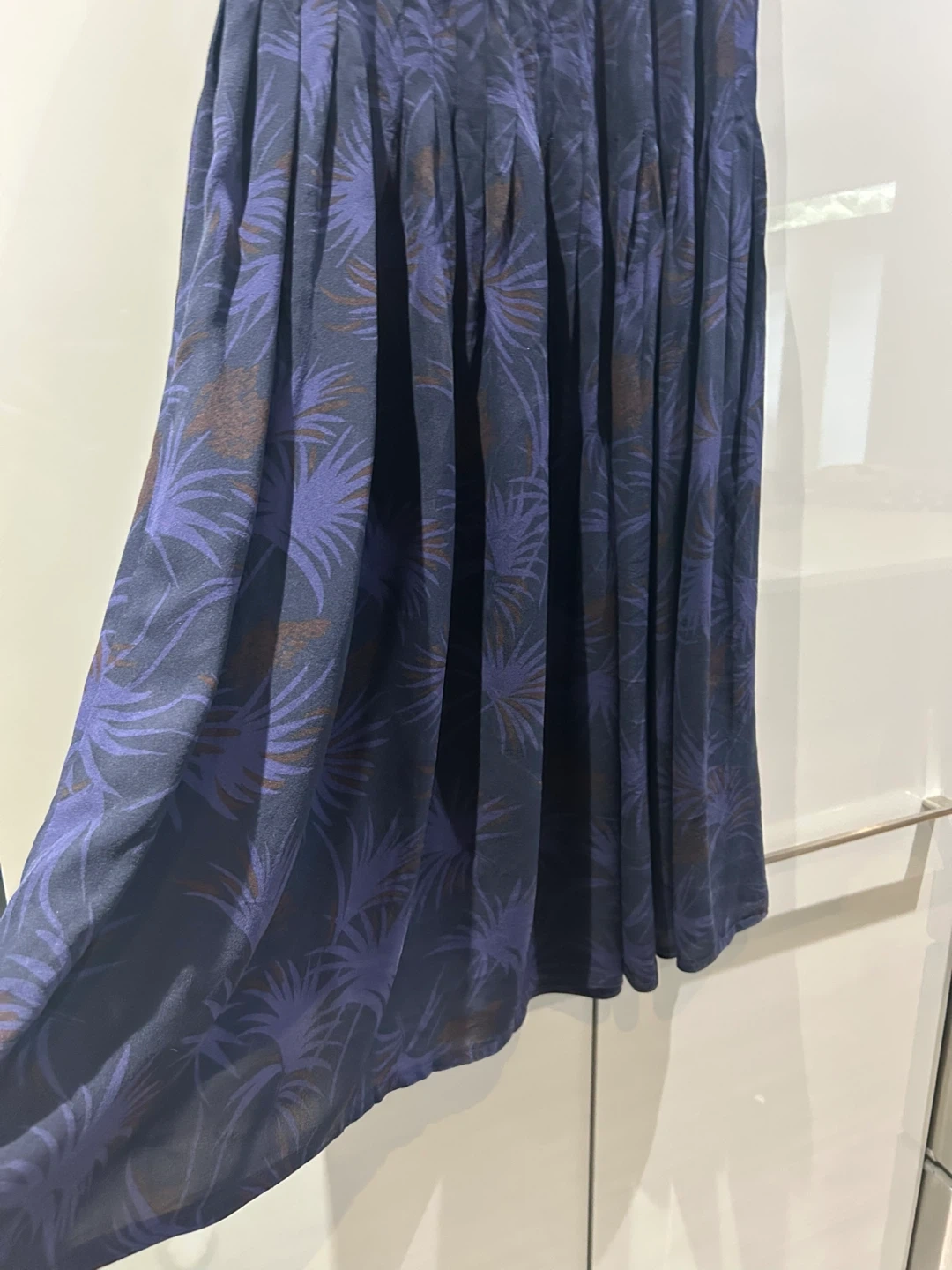 This Peter Nygard skirt is made of 100% silk. It features a dark navy base with a blue and brown palm leaf print. The skirt has a pleated design and hits around midi length.