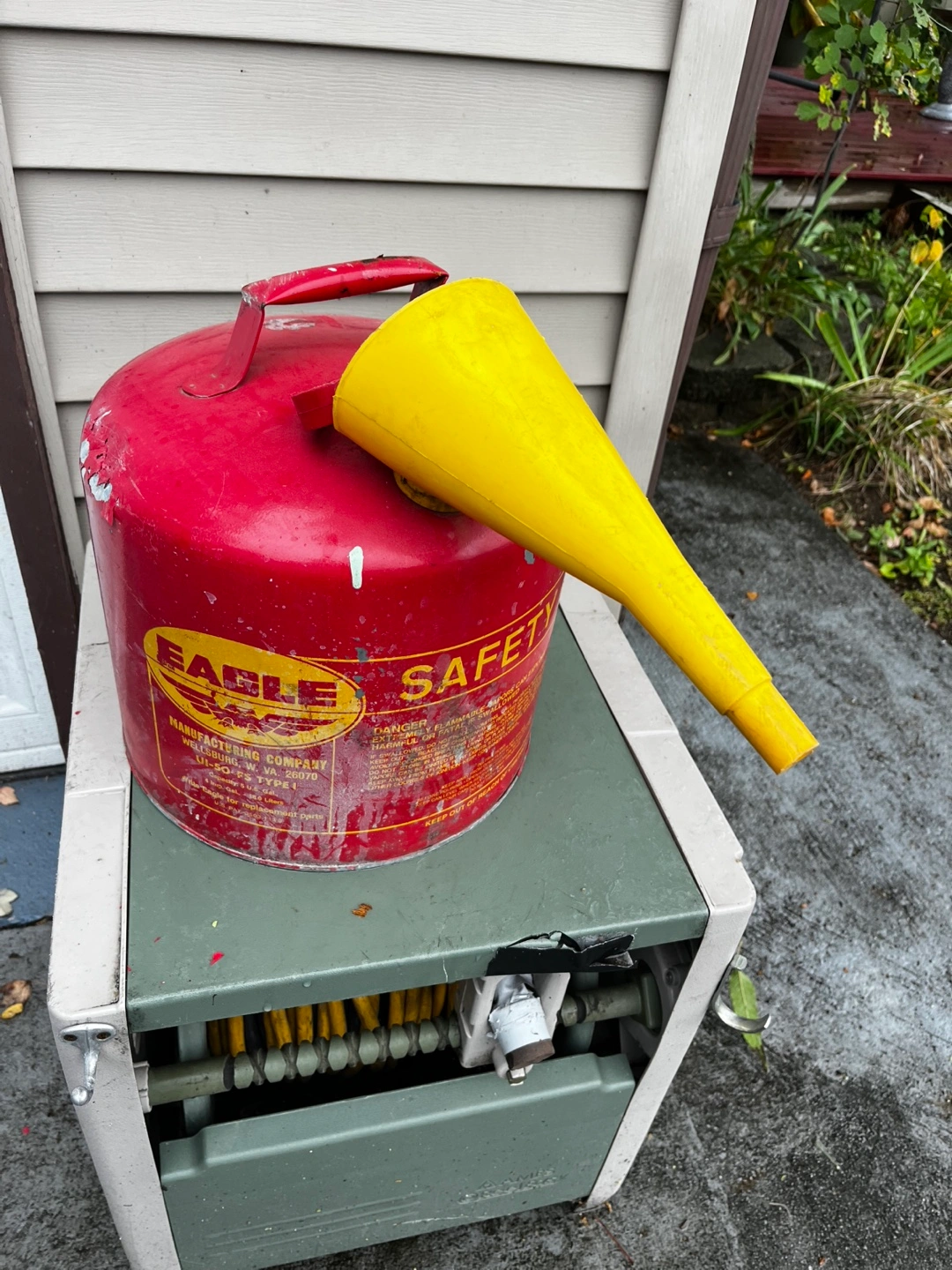 Selling a used Eagle Safety Can, perfect for storing flammable liquids. It comes with a yellow funnel for easy pouring. The can shows some signs of wear, but it's still functional and ready to use!