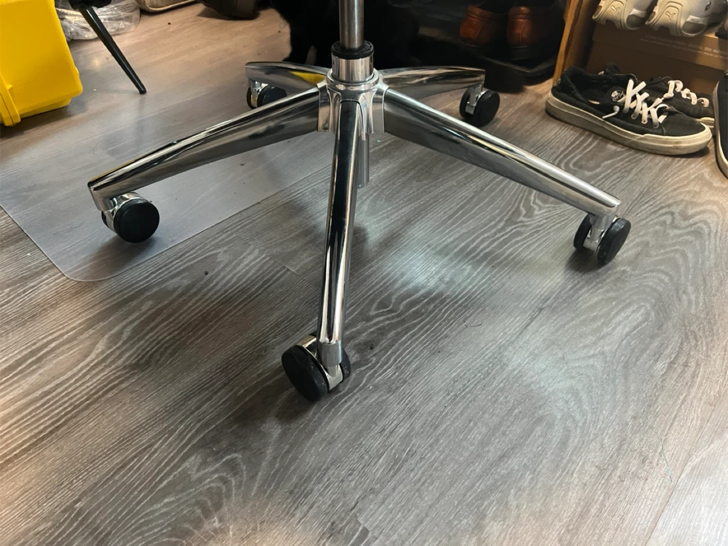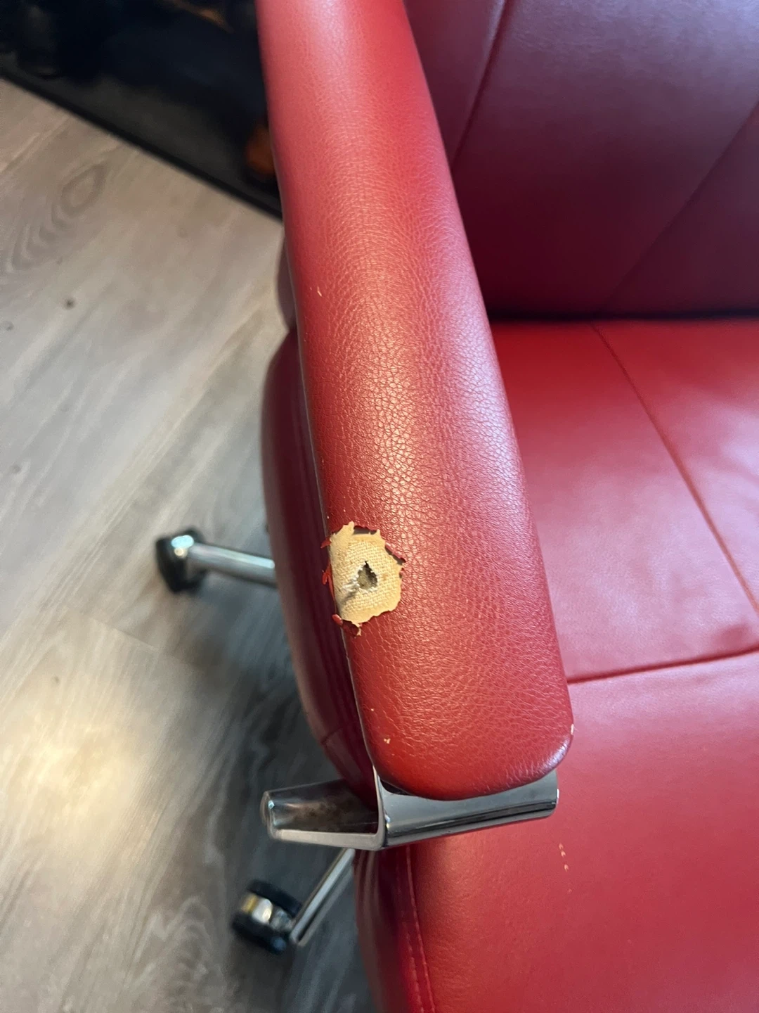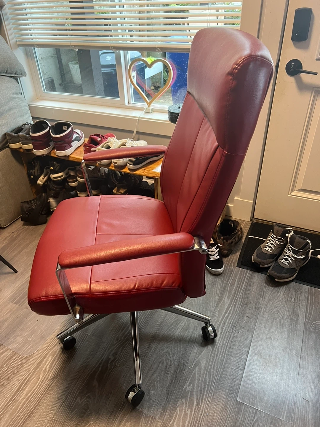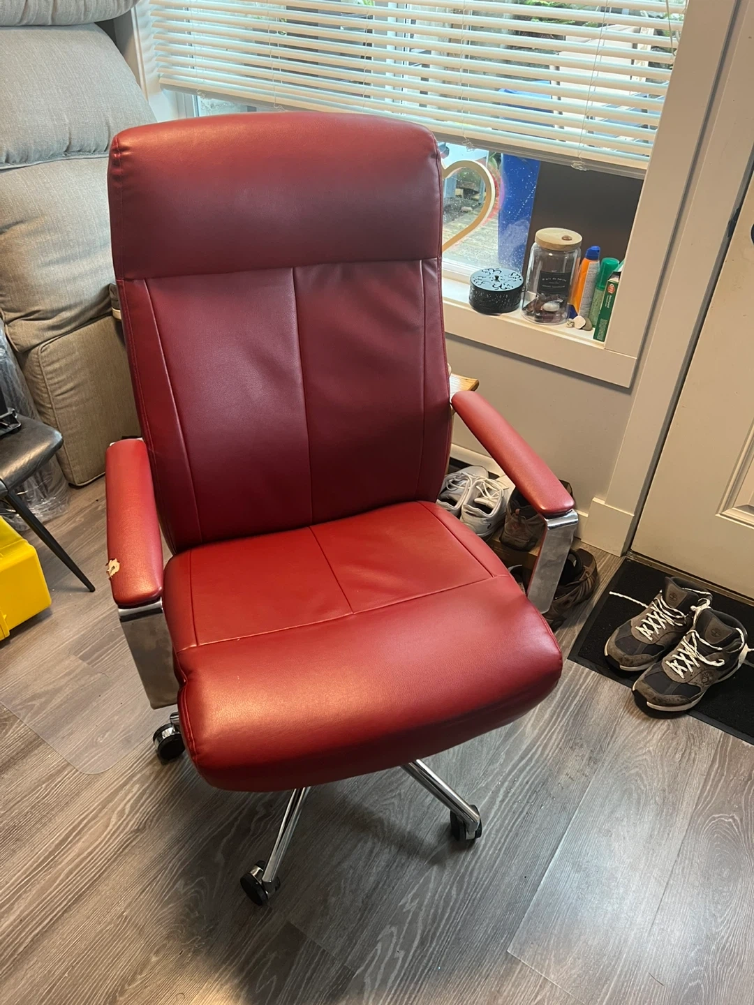 36Wonderful chair that we’ve had for three years approximately. Still stable and comfortable in very decent used condition. One small issue with upholstery on right armrest (see last photo ) but otherwise decent. Swivels, quiet, on castors. And best of all, FREE for P/U. Back 44” tall Seat height 20” max but adjustable down. Seat width 22”