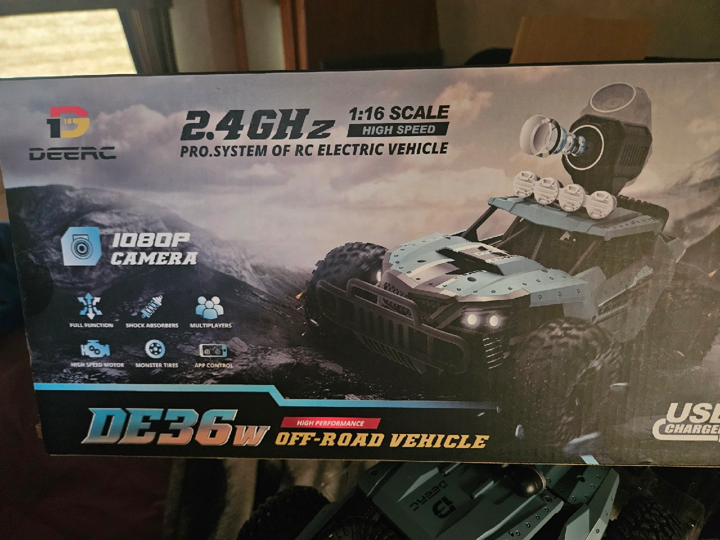 Selling a DEERC DE36W Off-Road Vehicle! It's a 1:16 scale, high-speed RC electric vehicle. It features a 1080P camera, full function, shock absorbers, and is app controlled. It also has monster tires!