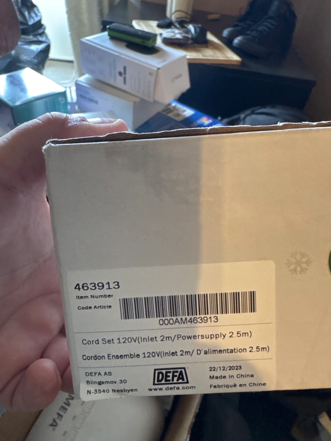 Selling a DEFA MiniPlug Cord Set 120V (Inlet 2m/Powersupply 2.5m). The box is included. It was made in China on 2023 December 22