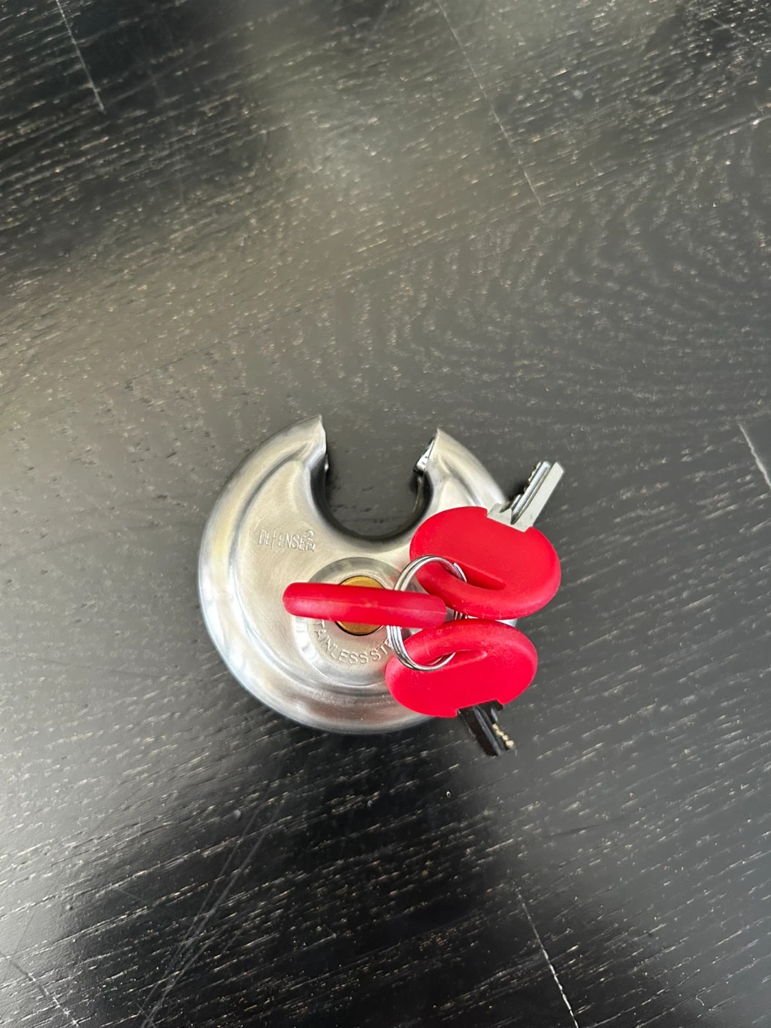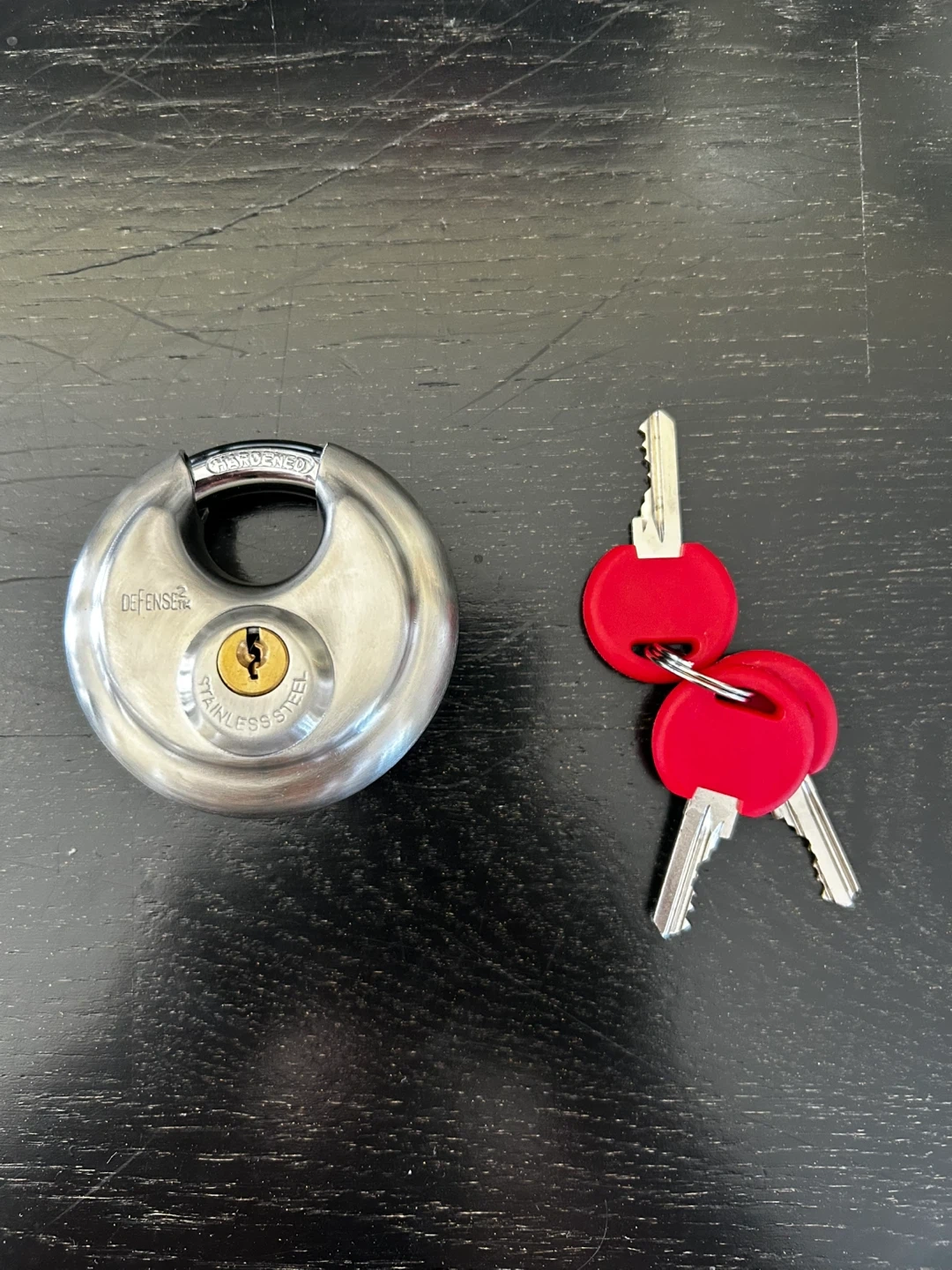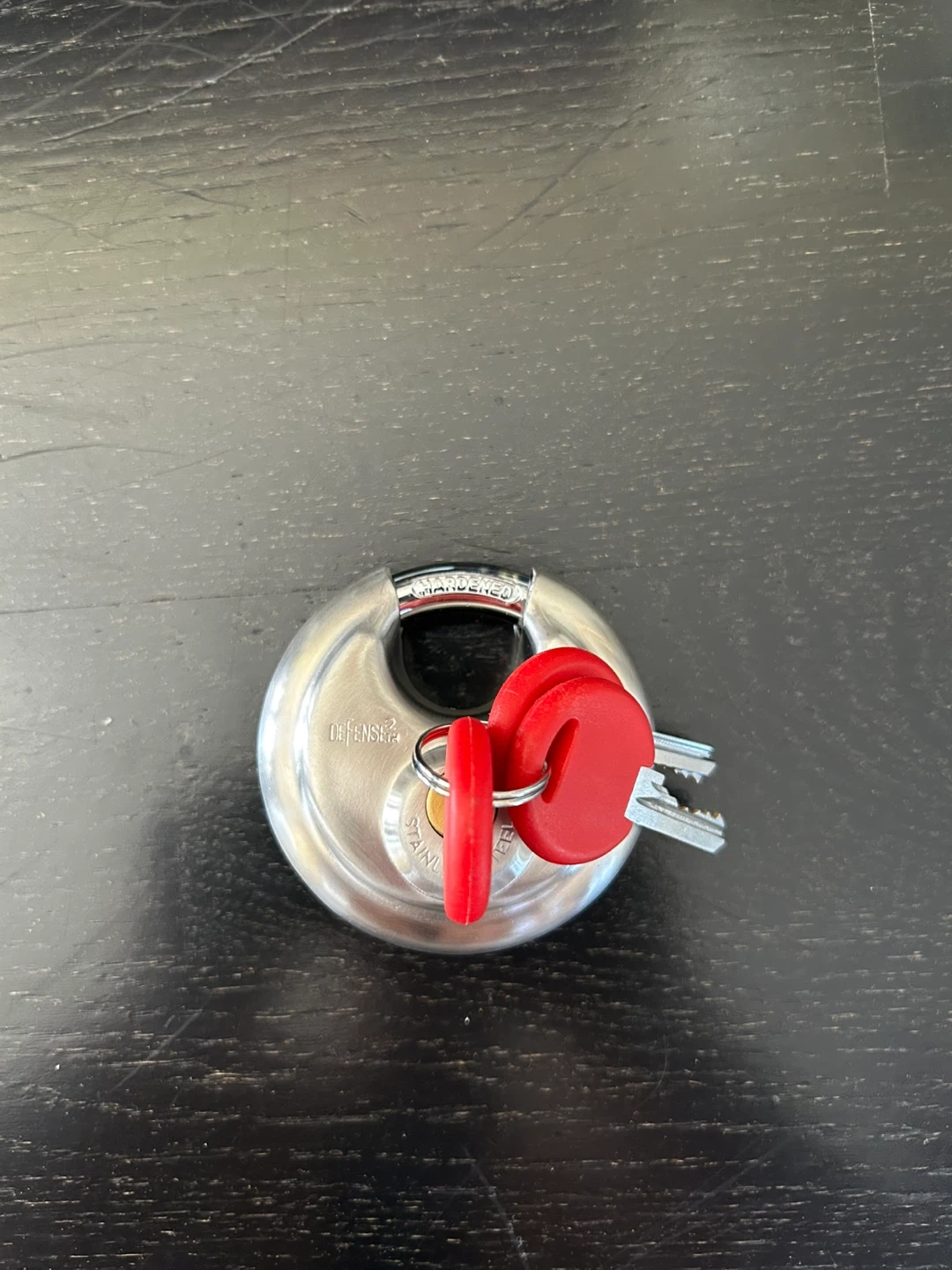 152Selling a Defender disc padlock made of stainless steel. It comes with the keys shown in the pictures. Great for securing your valuables! Just used once for public storage. Pick up at Yonge & Bloor Subway Station.