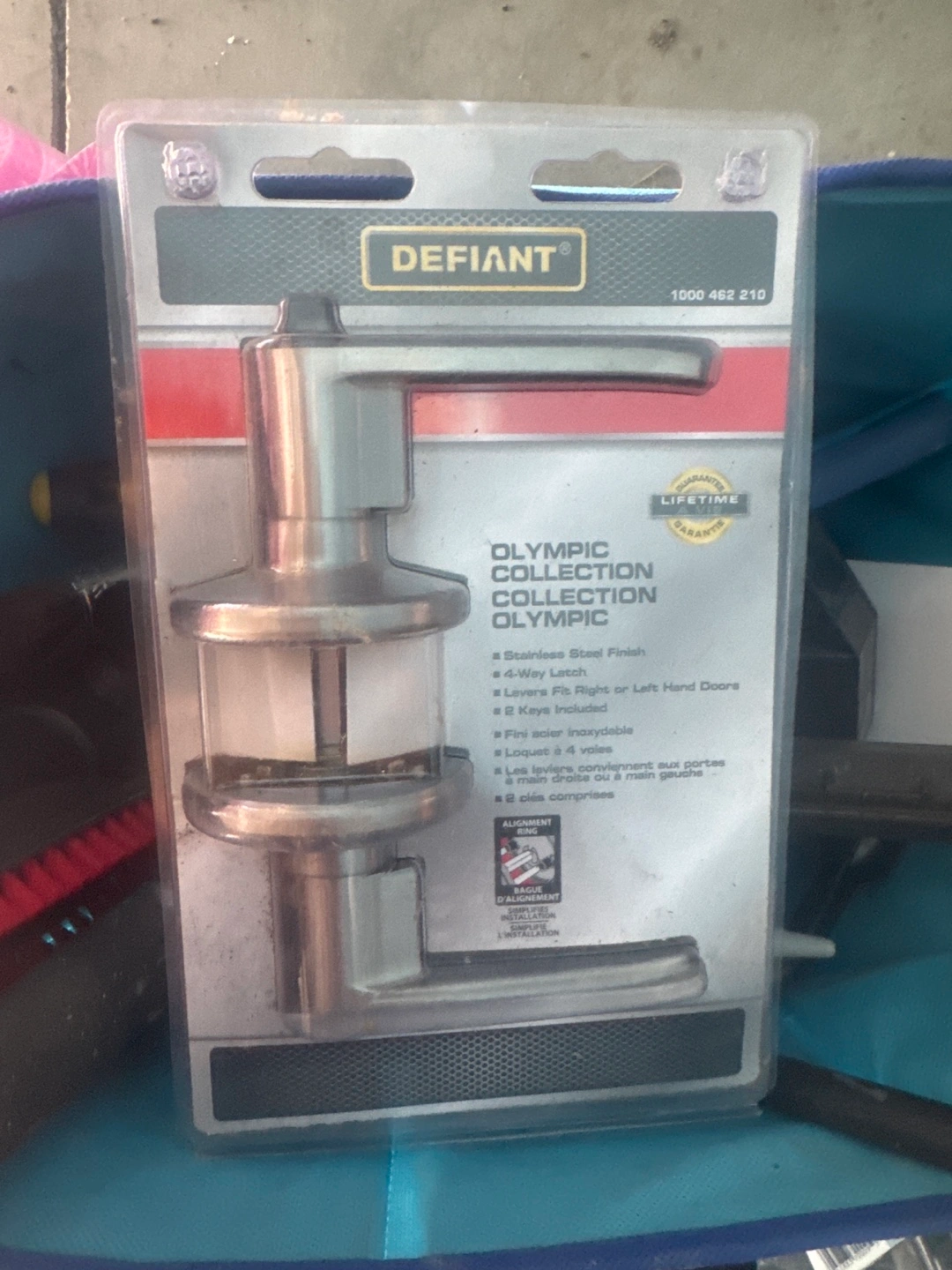 20Selling a brand new Defiant Olympic Collection door lever! It features a stainless steel finish and a 4-way latch. The levers fit both right and left-hand doors, and it comes with 2 keys included. It's still in its original packaging, ready for installation