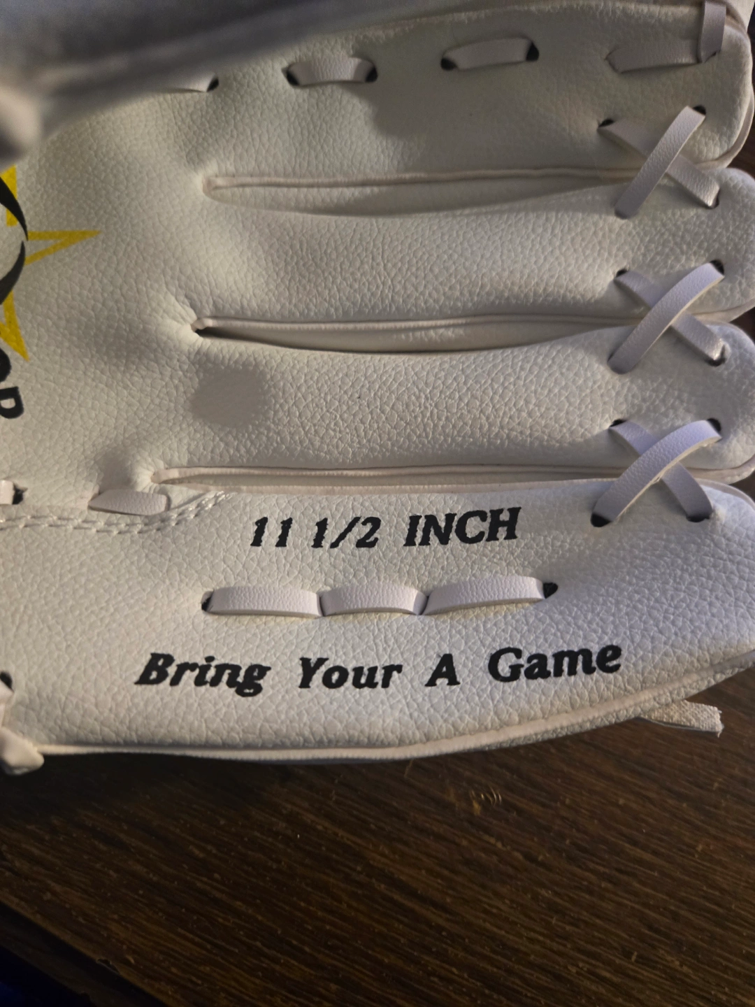 76Youth softball glove. 11 1/2 inch. White leather. Bring your A game.
